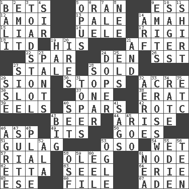 ACROSS 1. Wagers 5. NW Algerian seaport 9. Double-curved letter 12. Mine, in Marseilles 13. Light colored 14. Housemaid 15. One who doesn't tell the truth 16. Ubangi River tributary 17. Swiss mountan, "Queen of the Mountains" 18. It would 19. Part of HMS, perhaps 21. Following 22. Practice fight 24. Lair 26. Fast jet (abbr.) 27. Showing deterioration from age 28. Disposed of to a purchaser 29. The Jewish people; Israel 30. Ceases 32. Land measure 36. Groove 37. Single 38. Part of Q.E.F. 39. Snakelike fish 40. Practice fights 42. College mil. group 43. Fermented drink made from hops 44. Ascend 46. Viper 49. It is 50. Moves 51. POW camp 53. Bear (Spanish) 54. Soggy 57. Monetary unit of Yemen 58. Cassini of fashion 61. Connecting point 62. Singer James 63. Sew up the eyelids of hawks and falcons 64. One of the Great Lakes 65. Compass dir. 66. Do some clerical work 67. An important port of Yemen DOWN 1. Indonesian resort city 2. Give off 3. Inedible or poisonous agaric 4. Title for a knight 5. Musical composition 6. Actress Charlotte 7. Everything 8. Born 9. Sends forth 10. Gurus 11. Chest covering 14. Sandy's bark 19. Actor Linden 20. Angers 21. Also 23. Leg coverings 24. Drug addict 25. Raised railways 27. Drop; flow; fall 28. Echolocation 29. Compass dir. 31. Drinks excessively 32. Nest on high 33. What you're doing now 34. Pace 35. And so on (abbr.) 40. Arrange properly for use 41. Sinks 43. Large 45. Friend of Pooh 46. Match 47. Costumes for special activities 48. Food holder 52. Chicken ___ king 53. Stare 55. Singer Brickell 56. Adolescent 58. Order of Saint Francis (abbr.) 59. Luau accessory 60. Snakelike fish 61. Teachers' org.