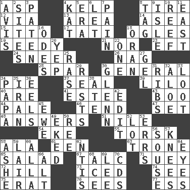 ACROSS 1. Cleo's killer 4. Seaweed 8. Hoop that covers a wheel 12. By way of 13. Length times width 14. Toward the sea 15. "Tell ____ the Marines!" 17. Jacques of French films 18. Stares 19. Shabby and untidy 21. Not either 23. Lizard (obsolete) 24. Contemptuous expression 26. Tired old horse 28. Practice fight 30. Commissioned military rank 34. Sliced dessert 37. Lick closed 39. _ and Stitch 40. "We ___ not amused" (Victoria) 41. First name in cosmetics 43. Sometimes accompanies a hiss 44. Light colored 46. Look after 47. Put into a specified state 48. Replies (to) 51. "Death on the ____" 54. Make supply last 55. Cod relative 58. Wing 61. Car or cant ending 63. Marketplace scale 65. Vegetable dish 67. Baby powder 71. Chop _ 72. Land elevation 73. On the rocks 74. Observe 75. Part of Q.E.F. 76. Perceives with the eye 77. Curvy letter DOWN 1. Deliberation 2. Settings 3. Eucharist need 4. Krazy ___ of comics 5. Period 6. Allow 7. Ache 8. Label 9. Capri or Wight 10. Coral collection 11. 90 degrees 16. Lyric poems 18. Northwest Algerian city 20. Slangy assent 22. Single 25. Raze (variant) 27. Set 29. Musical pauses 30. American astronaut and politician John 31. Teases 32. _ vera 33. Plunder 34. Dad 35. SW Asia republic 36. Snakelike fish 38. Had dinner 42. Prepare for publication 45. She-sheep 49. Supplemented with great effort 50. To separate or throw off 52. Car dealer's back yard 53. Blunders 56. Lush 57. Leg joints 58. American tennis player Robert 59. Den 60. Silent film actress Nazimova 62. Nuclear Threat Initiatives 64. Sight organs 66. Keyboard modifier key 68. Adept person 69. Area sheltered from the wind 70. Music discs