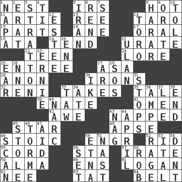 ACROSS 1. A home for chicks 5. Big collection agency 8. Being at a high temperature 11. Nick name for Arthur 13. To riddle 14. Edible starchy tuberous root 15. Components 16. One (Scot) 17. Relating to the mouth 18. _ moment's notice (2 wds.) 19. Watch over 21. A salt of uric acid 22. Adolescent 24. Old wives' tales, e.g. 25. Main course 27. White ___ sheet 29. Soon (poet.) 30. Removes the wrinkles 32. Painter Guido (1575-1642) 33. Proceeds 35. Falsehood 39. Related on the mother's side 41. Sign of things to come 42. Deep reverence 43. Slept 45. Play the lead 48. Domed church section 49. Unemotional 50. Engineer (abbr.) 52. To free from 55. Drawstring 56. R.R. building 57. Feeling or showing extreme anger 59. _ mater 60. Followers of ems 61. Utah city north of Ogden 62. Born 63. Make lace 64. Waist strap DOWN 1. California wine valley 2. Part of Q.E.F. 3. Ski resort town in Vermont 4. Teat (slang) 5. SW Asia republic 6. Tear apart 7. Observe 8. Ethiopian city, capital of Harari 9. Declaim 10. Lacquered or enameled metalware 12. First name in cosmetics 14. "Corrida" creature 20. Compass dir. 21. Uhlan (variant) 23. Bert's buddy 25. Hearing organ 26. Compass dir. 27. "We ___ not amused" (Victoria) 28. Mayday 30. Mamie's husband 31. Obstructs or blocks passage 33. The 23rd letter of the Hebrew alphabet 34. Had dinner 36. Electrical Measurement 37. Area sheltered from the wind 38. Conclude 40. Drug cop 43. Tired old horse 44. Showery time 45. Took without asking 46. Singer Mel 47. Opera by Verdi 49. Skim 50. Inactive volcano in Sicily 51. Political cartoonist Thomas 53. Slanted text style (abbr.) 54. Gouge 56. Put into a specified state 58. Director Reiner