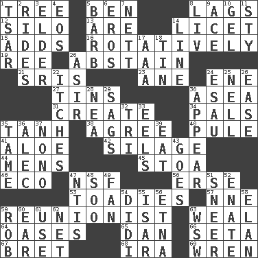 ACROSS 1. Relationship diagram 5. Benjamin's nick name 8. Straggles 12. Grain storage tower 13. "We ___ not amused" (Victoria) 14. It is permitted: Lat. 15. Does sums 16. Rotating or pertaining to rotation 19. To riddle 20. Refrain by choice 21. Indian titles of respect 23. A saturated hydrocarbon 24. Compass dir. 27. Airtight sealed metal containers 30. At sea 31. Cause to be 34. Friends 35. Hyperbolic tangent 38. Match 40. Whimper 41. Medicinal plant 42. Fodder prepared in a silo 44. Not women's 45. Portico 46. Environmental prefix 47. Overdraft (abbr.) 50. Celtic language 53. Sycophants 57. Compass dir. 59. One who advocates reunion 63. Welt 64. Fertile tracts in a desert 65. Daniel's nick name 66. Stalk of a moss capsule 67. Cy Young winner Saberhagen 68. Retirement account (abbr.) 69. Songbird DOWN 1. Russian ruler of old 2. Amusement-park features 3. A person who is older than you are 4. Greek goddess of the dawn 5. Sharp remark 6. Greek god of love 7. Remaining after all deductions 8. 54 in ancient Rome 9. Adept person 10. Set 11. Filthy place 14. Actor's bit 17. American Automobile Association (abbr.) 18. Shallow baking pan 20. SW Saudi Arabia district 22. Skin irritations 24. He sold his birthright 25. 1994 drama film starring Jodie Foster 26. Comfort 28. Teachers' org. 29. Sinks 30. Become visible 32. Three (prefix) 33. Snakelike fish 35. Docile 36. Actor Baldwin 37. Words to Nanette 39. Ingest 43. Leaves 47. Nuclear Threat Initiatives 48. "Barney Miller" actor Jack 49. Air blower 51. Contemptuous expression 52. Maternal 54. "You Light Up My Life" star Conn 55. Austrian river, tributary to the Danube 56. Inactive volcano in Sicily 58. Liveliness 59. Director Reiner 60. Ewer handle 61. Purpose 62. Fish or hair follower 63. Compass dir.