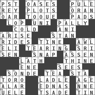 ACROSS 1. Pacific Standard Time (abbr.) 4. Fertile tracts in a desert 9. Whine 13. Marina Del _, California 14. Secret plans 15. NW Algerian seaport 16. Rowing implement 17. Woman's close-fitting hat 18. Writing tablets 19. Chop off 21. Single; one (prefix) 22. Friendly 24. Having a low temperature 26. Black tropical American cuckoo 27. Ascend 29. Comedian Laurel of Laurel & Hardy 30. Amusement-park features 31. Prong on a fork 33. Leather borer 36. Biblical high priest 37. Separating forcefully 40. _ Lanka 41. Elected rep. 42. Fastener 43. NE Netherlands city 45. Thin strip of wood or metal 47. One or ones belonging to thee 48. Compass dir. 49. Perceives with the eye 50. Something which is sent 52. Beverage made from leaves 54. R.R. building 56. "Corrida" creature 57. Dipping utensil 59. Ripen 61. Having or resembling wings 62. Ferber et al. 63. Compass dir. 64. Ubangi River tributary 65. Sadhe (variant) 66. Shallow baking pan DOWN 1. Adept person 2. Lick closed 3. Polypeptide antibiotic 4. Choose 5. Verbally 6. Within a short period 7. Needle holder 8. Compass dir. 9. Cotton for raincoats, e.g. 10. Mountain range 11. Kenny Rogers chart-topper in '80 12. Followers of ems 20. Airs 22. Eucharist need 23. Santa ___, CA 25. For fear that 27. Ancient Greek god of war 28. Cause heat under the collar 29. Clip 31. Hyperbolic tangent 32. Lyricist Gershwin 33. Helper 34. Songbird 35. Actor's bit 38. First name in cosmetics 39. Yard entry 44. "______ My Girl" (Turtles hit) 45. Poe poem 46. Added to 49. Vegetable dish 50. Flatfish 51. Spoken 52. Small boys 53. Pulitzer Prize-winning author Ferber 55. Hindu god of fire 56. The 19th letter of the Greek alphabet 57. Allow 58. Compass dir. 60. Car or cant ending