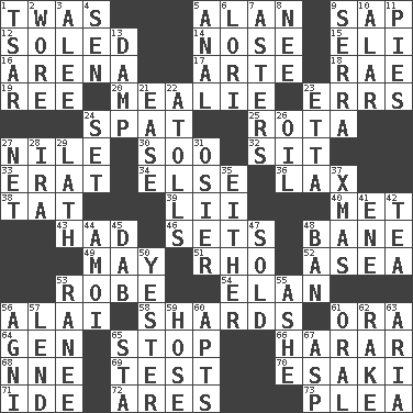 ACROSS 1. It was, poetically 5. ____ Jay Lerner 9. Plant excrement 12. Having a sole or soles 14. Sense of smell 15. Connecticut Ivy Leaguer 16. Sports stadium 17. Johnson of "Laugh-In" 18. Actress Charlotte 19. Portuguese money of account (variant) 20. Ear of corn 23. Blunders 24. Argument over a trivial matter 25. Roll call or roster of names 27. Mediterranean tributary 30. "Barney Miller" actor Jack 32. Be seated 33. Part of Q.E.F. 34. Otherwise 36. Not strict 38. Make lace 39. Cards in a Roman deck? 40. Was introduced to 43. Possessed 46. Puts into a specified state 48. Object of repulsion 49. Can I? 51. 17th letter of the Greek alphabet 52. At sea 53. Loose flowing garment 54. Flair 56. Jai ____ 58. Broken pieces 61. Mouth or opening 64. Commissioned mil. rank 65. Halt 66. Ethiopian city, capital of Harari 68. Compass dir. 69. Trial 70. 1973 Nobel Price Winner (Physics) Leo 71. Binary compound 72. Ancient Greek god of war 73. Entreaty DOWN 1. Russian ruler of old 2. Had on 3. Toward shelter 4. Elected rep. 5. Of or related to the anus 6. Australian parrot (variant) 7. Michaelmas daisies 8. Born 9. Father Junipero _ 10. Having or resembling wings 11. Sliced desserts 13. Moist 21. Comfort 22. Ringlike coral islands and reefs 23. Singer James 24. Arrange properly for use 26. Petroleum 27. Fish or hair follower 28. Retirement account (abbr.) 29. Thin strip of wood or metal 31. Flexible twig of a willow tree 35. One or the other 37. Dec. holiday 41. Compass dir. 42. Beverage made from leaves 44. Mine, in Marseilles 45. Pat or tap gently 47. Exchanged or delivered for money 48. Bar 50. Next before 53. Indian princess (variant) 55. American tennis player Robert 56. Hindu god of fire 57. Grant temporary use of 59. Flexible conduit 60. Tenement units (abbr.) 61. Relating to the mouth 62. Immoral or dissolute person 63. Operatic vocal solo 65. R.R. building 67. Cleo's killer