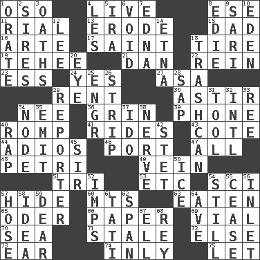 ACROSS 1. Bear (Spanish) 4. Moving, as bait 8. Compass dir. 11. Monetary unit of Yemen 13. Wear away 15. Male parent 16. Johnson of "Laugh-In" 17. Inhabitant of Heaven 18. Become fatigued 19. Giggle 21. Daniel's nick name 22. It's straight from the horse's mouth 23. Double-curved letter 24. It is so 27. White ___ sheet 29. Monthly bill 30. Moving about 34. Born 36. Smile widely 39. Give a jingle 40. Frolic 41. Amusement-park features 43. ____ d'Azur (French Riviera) 44. Goodbye (Sp.) 46. Left side of a ship or aircraft 47. Everything 48. _ dish (used to culture cells) 49. Distinctive style or manner 51. Three (prefix) 53. And so on (abbr.) 54. _-fi 57. Flintstone garb 60. Mountains (abbr.) 63. Consumed 65. Baltic tributary 66. Some stationery 69. Small bottle 70. Ocean 71. Lacking originality or spontaneity 72. Otherwise 73. Ewer handle 74. In an inward manner 75. Allow DOWN 1. Speak pompously 2. Founders of families 3. Expletives 4. French article 5. Retirement account (abbr.) 6. Nothingness 7. Pulitzer Prize-winning author Ferber 8. Singer Brickell 9. Indian skirt 10. Locale of original sin 12. Area sheltered from the wind 14. Inactive volcano in Sicily 18. File 13 20. Sight organ 25. Engineer (abbr.) 26. Long narrow piece of something 28. Plant excrement 29. Newsperson 31. Implement 32. International (abbr.) 33. Portuguese money of account (variant) 34. Thickened enlargement 35. Send forth 37. Wedding promise 38. Effrontery 40. Reproach for some lapse or misdeed 42. Proofreading order 45. Title for a knight 50. Frozen water 52. Naughty children 54. Free of sound 55. Stop 56. An arm off of a larger body of water 57. Flexible conduit 58. It may be bright or harebrained 59. Letter starter 61. Jacques of French films 62. Connect, as a bridge 64. "___ Maria" 67. Pipe bend 68. Marina Del _, California