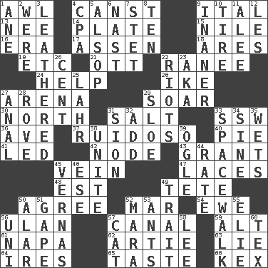 ACROSS 1. Leather borer 4. 2nd pers. sing. pres. of can (arch.) 9. Slanted text style (abbr.) 13. Born 14. Food holder 15. The longest river in the world 16. Epoch 17. NE Netherlands city 18. Ancient Greek god of war 19. And so on (abbr.) 21. Baseball player Mel 22. The wife of a rajah (variant) 24. Assist 26. Mamie's husband 27. Sports stadium 29. Fly high 30. _ pole 31. Table seasoning 33. Compass dir. 36. "___ Maria" 37. Noisy, rowdy, vocal (Spanish) 40. Sliced dessert 41. Directed 42. Thickened enlargement 43. Monetary aid 45. Distinctive style or manner 47. Shoestrings 48. Eastern Standard Time (abbr.) 49. False hair 50. Match 52. Third mo. 54. She-sheep 56. Uhlan (variant) 57. Lessep's creation 59. The first octave above the treble staff 61. California wine valley 62. Nick name for Arthur 63. Whopper 64. Angers 65. Clothes sense 66. A weed DOWN 1. One (Scot) 2. Past tense of be (plural) 3. Resembling or made to resemble leather 4. Tax preparer (abbr.) 5. Columnist Joseph or Stewart 6. Political cartoonist Thomas 7. Proofreading order 8. "___ Little Indians" 9. More empty; more void 10. Become fatigued 11. Toward shelter 12. French article 20. Penny 22. Debaucheries 23. Alias (abbr.) 25. Cowardly lion portrayer 27. Of or related to the anus 28. Be footloose 29. _ gin 31. The Jewish people; Israel 32. Find the sum of 33. High altitude stroll 34. Trig term 35. Moistens 38. Join together 39. Stare 44. Pace 45. Actresses Bloom and Felton 46. Compass dir. 49. Distinguishing feature 50. Having or resembling wings 51. Open wide 52. Hindu Mythology: god of death 53. Pismires 55. Writer Wiesel 56. Corn or form start 57. Feline 58. Area sheltered from the wind 60. John Ritter's dad