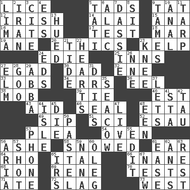 ACROSS 1. Louse (plural) 5. Small amounts or degrees 9. Make lace 12. From or relating to Ireland 14. Jai ____ 15. Santa ___, CA 16. Taiwanese island in East China Sea 17. Trial 18. Make imperfect 19. One (Scot) 20. Principles of right and wrong 23. Seaweed 24. Singer Brickell 25. Lodging establishments 27. Mild oath 30. June honoree 32. Compass dir. 33. Tennis shots 34. Blunders 36. Snakelike fish 38. Disorderly crowd 39. Standoff 40. Eastern Standard Time (abbr.) 43. Help 46. Lick closed 48. Singer James 49. Small drink 51. _-fi 52. Son of Isaac 53. Entreaty 54. Baking chamber 56. American tennis player Robert 58. Overwhelmed 61. Hearing organ 64. 17th letter of the Greek alphabet 65. Slanted text style (abbr.) 66. Silly 68. Electrically charged atom 69. French philosopher Descartes 70. Trials 71. Had dinner 72. Volcanic refuse 73. Compass direction DOWN 1. Pale green bean 2. SW Asia republic 3. Quote 4. Curvy letter 5. Jacques of French films 6. Actor Baldwin 7. Hyrax 8. Be seated 9. Makes less strong or intense 10. Of or related to the anus 11. Canvas cover 13. Took on color 21. Periodic rise and fall of the sea level 22. Centers of feelings and intuitions 23. Leg joint 24. Begley and Asner 26. Compass dir. 27. Shade tree 28. Thick or sticky substance 29. Swedish rock group 31. Frees from moisture 35. Manatee 37. Allows 41. R.R. building 42. The 19th letter of the Greek alphabet 44. Small island 45. Pass on 47. Moving, as bait 48. Car or cant ending 50. Soft color 53. Give a jingle 55. Prepare for publication 56. Operatic vocal solo 57. Guess 59. Nanny 60. Cassini of fashion 61. Comfort 62. Pismires 63. Repose 65. Big collection agency 67. ___ Haven, CT