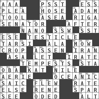 ACROSS 1. American Automobile Association (abbr.) 4. Inconspicuous attention getter 8. Curvy letter 11. Entreaty 13. Flexible conduit 14. First man 15. Utensil 16. Toward the sea 17. Port city in Latvia 18. Elected representative 21. Following 22. Billionth: prefix 23. Compass dir. 25. Fast jet (abbr.) 26. Compass dir. 29. A testis 32. Tarsus (plural) 34. Chicken ___ king 35. Cut the grass 38. Riding implement 39. NE Netherlands city 41. SW Asia republic 43. White ___ sheet 44. Allow 45. Feeling or showing extreme anger 46. Storms 50. R.R. building 51. Chief or king in Benin or Nigeria 54. Krazy ___ of comics 55. The longest river in the world 57. Nest on high 59. Pertaining to the sea 63. Ketch in the Levant 64. Soared 67. Assign a rank or rating to 68. Otherwise 69. French philosopher Descartes 70. Practice fight 71. Perceive with the eye 72. Wrote a lyric poem 73. The first octave above the treble staff DOWN 1. Flats, for short 2. _ vera 3. Age 4. N Egypt peninsula 5. Distress signal 6. Compass dir. 7. Beverage made from leaves 8. Proofreads 9. Gurus 10. Don Adams' spy role 12. Actor Alda or Thicke 14. Sandy's bark 19. Jacques of French films 20. Single 21. Leather borer 23. Filth; sediment 24. Glance over 26. And so on (abbr.) 27. "Two Mules for Sister ____" 28. Greek god of love 30. Clothes sense 31. Independent ruler or chieftain 33. Petty quarrel 36. Mouths or openings 37. Electrical Unit 39. _ mater 40. Back-to-school mo. 42. Teachers' org. 45. Capri or Wight 47. Supplement with great effort 48. Overwhelmed 49. Nervous spasm 51. Fertile tracts in a desert 52. Calif. Air Force Base 53. Get up 56. Hearing organs 58. Frozen water 60. California wine valley 61. Slanted text style (abbr.) 62. An absolute certainty 64. Back 65. Directed 66. Compass dir.