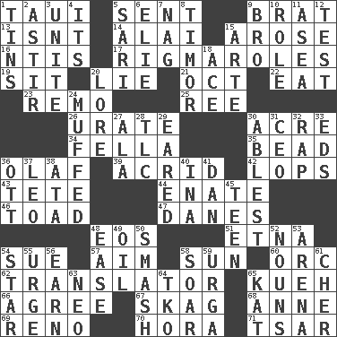 ACROSS 1. "Change" in Tahitian 5. Transmitted 9. Naughty child 13. Is not 14. Jai ____ 15. Came up 16. Nuclear Threat Initiatives 17. Frustrating wastes of time 19. Be seated 20. Whopper 21. Sep. follower 22. Consume 23. San ____ (Riviera town) 25. To separate or throw off 26. A salt of uric acid 30. Land measure 34. Chap (slang) 35. Necklace unit 36. Norwegian king 39. Bitter 42. Chops off 43. Wig 44. Maternal 46. Frog relative 47. Natives or inhabitants of Denmark 48. Greek goddess of the dawn 51. Inactive volcano in Sicily 54. Take to court 57. Direct toward a target or goal 58. Player for Phoenix 60. The grampus (Milton) 62. Interpreter 65. Malaysian steamed pastry 66. Match 67. Heroin 68. Singer Murray 69. Former U.S. Attorney General Janet 70. Israeli folk dance 71. Russian ruler of old DOWN 1. Metal containers 2. Being in motion 3. Join together 4. ___ a Wonderful Life 5. Indian skirt 6. Writer Wiesel 7. Tired old horse 8. Southeast Indonesia island 9. Sis' sibling 10. Hero or heavy, e.g. 11. Toward the sea 12. Trial 15. Johnson of "Laugh-In" 18. Adept person 20. Old wives' tales, e.g. 24. Bungled 27. According to 28. Affectionate concern, for short 29. Having ears or earlike features 30. Most capable 31. Corporate head (abbr.) 32. Hit sharply and swiftly 33. Begley and Asner 36. Baseball player Mel 37. Lion 38. _ moment's notice (2 wds.) 40. _ tizzy (2 wds.) 41. One of the 12 tribes of Israel 45. Adolescent 48. Relaxation 49. Petroleum 50. Box-office sellout 52. Parts of speech 53. Sports stadium 54. Play the lead 55. Goad 56. Merit 58. Fly high 59. Capital and largest city of Mongolia 61. "Mermaids" star 63. Modern: prefix 64. Ring climax 65. Krazy ___ of comics