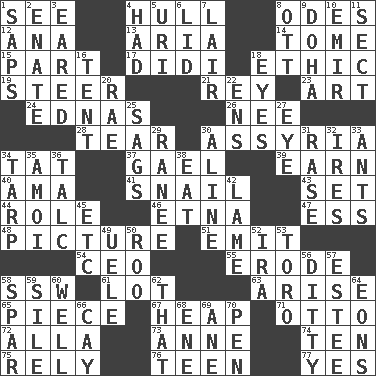 ACROSS 1. Observe 4. Frame or body of a ship 8. Lyric poems 12. Santa ___, CA 13. Roberta Peters solo 14. Heavy book 15. Piece 17. "You Light Up My Life" star Conn 18. Value system 19. Guide 21. Marina Del _, California 23. Nonscientific branch of learning 24. Ferber et al. 26. Born 28. Lacerate 30. Nineveh was its capital 34. Make lace 37. Highlander 39. Merit 40. Nanny (var.) 41. Slow-paced one 43. Put into a specified state 44. Hero or heavy, e.g. 46. Inactive volcano in Sicily 47. Double-curved letter 48. Photo 51. Give off 54. Corporate head (abbr.) 55. Eat (away) 58. Compass dir. 61. Car dealer's back yard 63. Ascend 65. Part 67. Pile 71. "Beetle Bailey" pooch 72. Silent film actress Nazimova 73. Queen of England 1702-14 74. Nine, plus one 75. Have confidence or faith in 76. Adolescent 77. Consenting reply DOWN 1. Plant excrements 2. Related on the mother's side 3. Having ears or earlike features 4. Possessed 5. RI univ. 6. Hat (slang) 7. Den 8. Baseball player Mel 9. Capital of the state of Qatar 10. Independent ruler or chieftain 11. Religious group 16. Portable shelter 18. Sight organs 20. Actress Charlotte 22. Followers of ems 25. Settles 27. Sight organ 29. Indian princess (variant) 30. Place in a line 31. To erase 32. Angers 33. Pismires 34. Canvas cover 35. Mine, in Marseilles 36. Baby powder 38. Consume 42. Unable to walk 45. And so on (abbr.) 49. Ubangi River tributary 50. Friend of Pooh 52. Retirement account (abbr.) 53. "Corrida" creature 56. Short, simple song 57. First name in cosmetics 58. Coast Guard woman 59. Filth; sediment 60. Not ill 62. Not this but _ 64. Immeasurably long periods of time 66. Island 68. Compass dir. 69. One (Scot) 70. Writing instrument