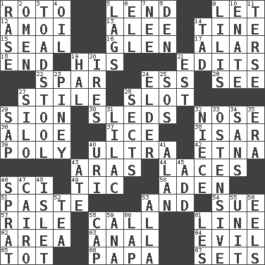 ACROSS 1. Printing process, for short 5. Grant temporary use of 9. Allow 12. Mine, in Marseilles 13. Toward shelter 14. Prong on a fork 15. Lick closed 16. Small, secluded valley 17. Having or resembling wings 18. Conclusion 19. Part of HMS, perhaps 21. Proofreads 22. Practice fight 24. Double-curved letter 26. Observe 27. Vertical member of a panel or frame 28. Slit 29. The Jewish people; Israel 30. Bobsleighs 32. Olfactory organ 36. _ vera 37. Frozen water 38. Austrian river, tributary to the Danube 39. More than one (prefix) 40. Extremist 42. Inactive volcano in Sicily 43. Ancient river in northeast Turkey 44. Shoestrings 46. _-fi 49. Nervous spasm 50. Arabian gulf 51. Thick mixture 53. Plus 54. Take to court 57. Cause heat under the collar 58. Give a ring to 61. Actor's bit 62. Length times width 63. Of or related to the anus 64. Tending to cause great harm 65. Small child 66. Dad 67. Puts into a specified state DOWN 1. Raze (variant) 2. Sign of things to come 3. Inedible or poisonous agaric 4. Petroleum 5. Falls behind 6. Pipe bend 7. Born 8. Lair 9. Ms. Damita and namesakes 10. Maternal 11. Laconic 14. Small boy 19. Actor Linden 20. Angers 21. Eastern Standard Time (abbr.) 23. Abounding in pines 24. A person who is older than you are 25. Mayday 27. Grain storage tower 28. Religious groups 29. Plant excrement 31. Pale purple color 32. Sibling's daughter 33. Clearly or manifestly demonstrative 34. Without 35. Period 40. RI univ. 41. Actor Alda or Thicke 43. Had dinner 45. Find the sum of 46. Small fatty European fish 47. Capital of Egypt 48. Small island 52. Beverage made from leaves 53. Silent film actress Nazimova 55. A single undivided whole 56. Snakelike fish 58. Head covering 59. Santa ___, CA 60. Infant locale 61. French article
