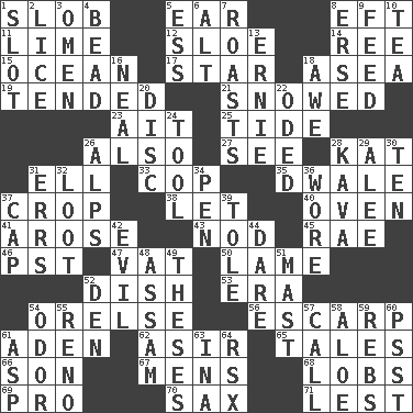 ACROSS 1. Messy guy 5. Ewer handle 8. Newt 11. Welles in "The Third Man" 12. _ gin 14. Portuguese money of account (variant) 15. Sea 17. Play the lead 18. At sea 19. Looked after 21. Frozen precipiation fell 23. Small island 25. Event that recurs at intervals 26. In addition 27. Perceive with the eye 28. Krazy ___ of comics 31. Pipe bend 33. Police officer (slang) 35. A sleeping potion; an opiate (poet.) 37. Riding implement 38. Allow 40. Baking chamber 41. Came up 43. Lower and raise head in agreement 45. Actress Charlotte 46. Pacific Standard Time (abbr.) 47. Large container 50. Unable to walk 52. Food container 53. Period 54. Threatening words 56. Fortification 61. An important port of Yemen 62. SW Saudi Arabia district 65. Stories 66. Boy, to dad 67. Not women's 68. Tennis shots 69. Adept person 70. Saxophone 71. For fear that DOWN 1. Notch 2. Louse (plural) 3. Presage 4. Necklace unit 5. Curvy letter 6. The first octave above the treble staff 7. Cooks with dry heat, as in an oven 8. Celtic language 9. Nourish 10. Beverage made from leaves 13. Bert's buddy 16. Anneal 18. Deep reverence 20. Compact _ 22. Wrote a lyric poem 24. Utensil 26. High mountains 28. Polynesian shrub of the pepper family 29. Toward shelter 30. "___ Little Indians" 31. Blunders 32. Spoils 34. Fenced enclosure 36. Had on 37. Head covering 39. Lacquered or enameled metalware 42. Morally bad or wrong 44. Have the gumption 48. Indian state 49. College papers 51. Vertical spar for supporting sails 52. Lair 54. Scent 55. Former U.S. Attorney General Janet 57. Give a ring to 58. Medicinal plant 59. Confederate soldiers (slang) 60. Inconspicuous attention getter 61. Cleo's killer 63. _ tizzy (2 wds.) 64. Acura sports coupe