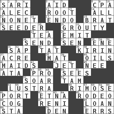 ACROSS 1. Indian skirt 5. Assist 8. Tax preparer (abbr.) 11. Actor Baldwin 12. Carrot, for example 14. 100% 15. Music written for nine 17. Inside; within (prefix) 18. Naughty child 19. Sowing specialist 21. Sullen 23. Afternoon social gathering 25. Send forth 26. Transmit 27. Elected rep. 28. Compass dir. 31. Plant excrement 33. Make lace 35. Japanese brewing company 37. 43,560 square feet 38. Floor covering 40. Lubricates 41. Women servants 43. Type of plane 45. Born 46. _ moment's notice (2 wds.) 47. Adept person 50. Perceives with the eye 52. Fly high 53. Scottish cap 54. A period of five years 56. Full of chinks, cracks, or crevices 61. Sweet dark-red dessert wine 62. Inactive volcano in Sicily 65. Cowboy competition 66. Gear tooth 67. Painter Guido (1575-1642) 68. Grant temporary use of 69. R.R. building 70. Lair 71. Blunders DOWN 1. Without 2. Medicinal plant 3. French philosopher Descartes 4. On the rocks 5. "We ___ not amused" (Victoria) 6. Electrically charged atom 7. Evades 8. Heavy open wagon 9. Frolic 10. Keyboard modifier key 13. Singer Mel 16. Wig 18. On the contrary 20. Monthly bill 22. Pig sound 24. First of billions? 26. Broke a traffic law 28. One of the Great Lakes 29. "Death on the ____" 30. Followers of ems 31. Scram, to a cat 32. Roberta Peters solo 34. _ Mahal 36. Charged particles 37. Wet nurse (var.) 39. Trial 42. Blemish 44. Pull into pieces 48. More uncommon 49. Declaimed 51. Independent ruler or chieftain 52. Fast jet (abbr.) 54. Plunder 55. Capital and largest city of Mongolia 57. Undercover agent 58. Aroma 59. Shrivel 60. Immeasurably long periods of time 61. Personal Computers (abbr.) 63. Compass dir. 64. The 18th letter of the Arabic alphabet