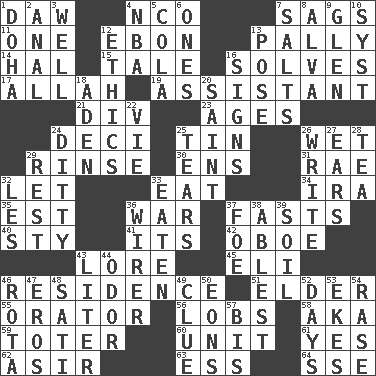 ACROSS 1. Fool 4. Non-commissioned officer (abbr.) 7. Settles 11. Single 12. Inky black, to poets 13. Friendly 14. Actor Linden 15. Lie 16. Finds the solution 17. Assad's deity 19. Helper 21. HTML Container Element 23. Eons 24. Tenth: prefix 25. Shallow baking pan 26. Dripping 29. Wash lightly 30. Followers of ems 31. Actress Charlotte 32. Allow 33. Ingest 34. Retirement account (abbr.) 35. Eastern Standard Time (abbr.) 36. Armed conflict 37. Goes without food and/or water 40. Filthy place 41. It is 42. Mitch Miller's instrument 43. Old wives' tales, e.g. 45. Connecticut Ivy Leaguer 46. Home 51. A person who is older than you are 55. Speaker 56. Tennis shots 58. Alias (abbr.) 59. Carrier 60. A single undivided whole 61. It is so 62. SW Saudi Arabia district 63. Double-curved letter 64. Compass dir. DOWN 1. Capital of the state of Qatar 2. Of or related to the anus 3. Water source 4. Basketball assoc. 5. Root beer relative 6. Washington bills 7. Table seasonings 8. Inventor's middle name 9. Small, secluded valley 10. System (abbr.) 12. Moral principles 13. Airs 16. Signals 18. An important port of Yemen 20. Virtuous person 22. Compete 24. Simple song 25. Separates forcefully 26. Compose 27. Hearing organs 28. Beverage made from leaves 29. State of inaction 32. French article 33. Consumed 36. One who wires 37. Enemy 38. Most capable 39. Earth 43. 61 cubic inches 44. Scent 46. Round or rotation of duties 47. Greek god of love 48. Suttee (variant) 49. A slight indication 50. Immeasurably long periods of time 52. 24-hour periods 53. Supplements with great effort 54. To erase 57. Twice