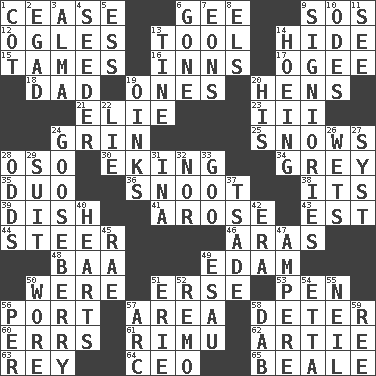ACROSS 1. Desist 6. Turn to the right 9. Mayday 12. Stares 13. Instrument 14. Flintstone garb 15. Corrects by punishment or discipline 16. Restaurants 17. Double curve, resembling the letter S 18. Male parent 19. Singles 20. Coop moms 21. Writer Wiesel 23. One more than two 24. Smile widely 25. Overwhelms 28. Bear (Spanish) 30. Supplementing with great effort 34. Jennifer or Joel 35. Superhero pair 36. Snob 38. It is 39. Food container 41. Came up 43. Eastern Standard Time (abbr.) 44. Guide 46. Caspian sea tributary 48. Sound made by sheep 49. Dutch treat 50. Past tense of be (plural) 51. Celtic language 53. Fenced enclosure 56. Sweet dark-red dessert wine 57. Length times width 58. Prevent from occurring 60. Blunders 61. Tall New Zealand timber tree 62. Nick name for Arthur 63. Marina Del _, California 64. Corporate head (abbr.) 65. Calif. Air Force Base DOWN 1. Small bed 2. Mild oath 3. _ mater 4. Sowing specialist 5. Double-curved letter 6. Went 7. Immeasurably long periods of time 8. Raised railways 9. Seigniories (variant) 10. Lyric poems 11. Perceive with the eye 13. Prong on a fork 14. Weeding 19. Pig sounds 20. Part of HMS, perhaps 22. Whopper 24. Sour, prickly fruit 26. Moistens 27. System (abbr.) 28. Probability 29. Costume for a special activity 31. _ tizzy (2 wds.) 32. Not either 33. Thick or sticky substance 37. Sadhe (variant) 40. Centers 42. Period 45. Actress Charlotte 47. Electrical Unit 49. He sold his birthright 50. Had on 51. 4th largest of the Great Lakes 52. San ____ (Riviera town) 54. Singer James 55. Famous astronaut Armstrong 56. For each 57. Curve 58. Pat or tap gently 59. To sift