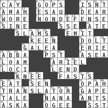 ACROSS 1. Island 4. Republicans 8. Is not 12. Nursemaid 14. He sold his birthright 15. Letter starter 16. Had on 17. Unrelated to defense, as in spending 20. Trig term 21. Compass dir. 22. Had dinner 23. Shuts with force 27. Send forth 29. Peachy ____! 31. Dunce 34. An organ shaped like a helmet 35. 4th largest of the Great Lakes 36. Swedish rock group 39. Pacific Standard Time (abbr.) 41. At sea 42. Rich soil 43. Satellite of Uranus 46. Event scenes 47. Grant temporary use of 48. Leg joint 51. Goes without food and/or water 54. Erode 56. Elected rep. 58. Brightly colored fish 61. Interpreter 66. Yawn 67. Falsehood 68. Nanny 69. Pismires 70. "____ silly question..." 71. Double curve, resembling the letter S 72. Fast jet (abbr.) DOWN 1. Crow sounds 2. Mine, in Marseilles 3. Tall tales 4. Commissioned military rank (abbr.) 5. Bear (Spanish) 6. Baking dish 7. Soap bubbles 8. Binary compound 9. Legislators 10. Political cartoonist Thomas 11. Relationship diagram 13. The bottom of a shoe or boot 18. Compass dir. 19. Opposite of masc. 24. Alias (abbr.) 25. Cartoonist voice _ Blanc 26. Ooze 28. Perfect 30. Rhinal 32. Whopper 33. Beverage made from leaves 34. Street urchin 36. 100% 37. Sometimes accompanies a hiss 38. Sass 40. Unclean, religiously 44. _ tizzy (2 wds.) 45. Begley and Asner 49. Curvy letter 50. Snakelike fish 52. Ancient Roman robe 53. Connects, as a bridge 54. Singer James 55. Ancient river in northeast Turkey 57. Billionth: prefix 59. Flats, for short 60. Command 62. Teachers' org. 63. Label 64. Single 65. Actress Charlotte