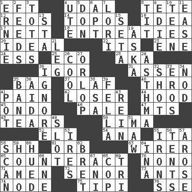 ACROSS 1. Bank Draft (abbr.) 4. Hereditary estate 8. False hair 12. Vintage cars 14. Traditional theme or motif 16. The content of cognition 17. Remaining after all deductions 18. Pleas 20. Standard of perfection 22. ___ a Wonderful Life 23. Compass dir. 24. Curvy letter 25. Environmental prefix 28. Alias (abbr.) 30. Russian composer Stravinsky 31. NE Netherlands city 35. Paper or plastic container 37. Norwegian king 40. Through, poetically 41. Ache 42. Failure 44. Parka part 45. Southwest Nigerian state 46. Diluted with white 47. Mountains (abbr.) 48. Pulls into pieces 50. Pale green bean 52. Biblical high priest 54. Santa ___, CA 55. Call ___ day 58. Quiet! 61. Globe 63. One who wires 65. Act in opposition 70. Words to Nanette 71. So be it 72. Sir (Sp.) 73. Pismires 74. Connecting point 75. Native american tent (variation) 76. Compass dir. DOWN 1. Bert's buddy 2. Eats 3. Lugs 4. Shoshoni 5. Spanish title 6. Fitting 7. Australian parrot (variant) 8. Teat (slang) 9. Singer Brickell 10. Adolescent 11. Comfort 13. R.R. building 15. Stalk of a moss capsule 19. "____ silly question..." 21. Part of a journey 26. Calm and collected 27. Fourth or lowest deck 29. Respiratory problem 30. Snub 32. Went for two points 33. Greek god of love 34. Allow head to fall sleepily 35. Object of repulsion 36. Opera by Verdi 38. White ___ sheet 39. Man or boy (slang) 41. Cooking vessel 43. It's straight from the horse's mouth 49. Narrow, elongated depression 51. Opening into something insatiable 53. Angers 55. Metal shackles 56. Portable shelters 57. Came up 58. Examine hastily 59. Same (prefix) 60. Became colored 62. Cy Young winner Saberhagen 64. _ tizzy (2 wds.) 66. Compass dir. 67. Black tropical American cuckoo 68. Police officer (slang) 69. Three (prefix)