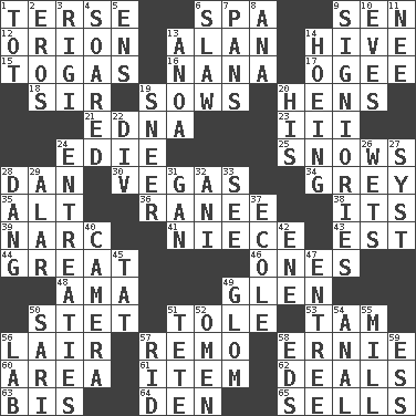 ACROSS 1. Laconic 6. Health resort 9. Elected rep. 12. Greek mythologigal hunter 13. ____ Jay Lerner 14. Hub of activity 15. Ancient Roman robes 16. Grandmother 17. Double curve, resembling the letter S 18. Title for a knight 19. Sty mamas 20. Coop moms 21. Pulitzer Prize-winning author Ferber 23. One more than two 24. Singer Brickell 25. Frozen precipitation (plural) 28. One of the 12 tribes of Israel 30. Viva Las _ 34. Jennifer or Joel 35. Keyboard modifier key 36. Indian princess (variant) 38. ___ a Wonderful Life 39. Drug cop 41. Sibling's daughter 43. Eastern Standard Time (abbr.) 44. Relatively large 46. Singles 48. Housemaid (var.) 49. Small, secluded valley 50. Proofreading order 51. Lacquered or enameled metalware 53. Scottish cap 56. Den 57. San ____ (Riviera town) 58. Bert's buddy 60. Length times width 61. A whole individual unit 62. Allots cards 63. Twice 64. Lair 65. Exchanges for money DOWN 1. Small child 2. Greek god of love 3. Swiss mountan, "Queen of the Mountains" 4. Flew 5. Followers of ems 6. Cole _ (cabbage dish) 7. Zero-star reviews 8. Santa ___, CA 9. Seigniories (variant) 10. Nights before holidays 11. Born 13. Small Philippine buffalo 14. Cultivating 19. Scornful expression 20. Part of HMS, perhaps 22. HTML Container Element 24. Pleas 26. Moistens 27. System (abbr.) 28. Mild oath, euphamism for damn 29. Having or resembling wings 31. Separate the seeds from cotton 32. Black tropical American cuckoo 33. Observe 37. Learning spot: Fr. 40. Device for capturing images 42. Compass dir. 45. Make lace 47. Main course 49. Take by theft 50. Indian skirt 51. False hair 52. Sign of things to come 54. Of or related to the anus 55. Place where flour is made 56. Experiment locale 57. To free from 58. Begley and Asner 59. Double-curved letter