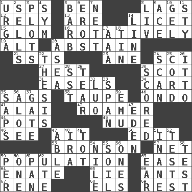 ACROSS 1. United States Postal Service (abbr.) 5. Benjamin's nick name 8. Straggles 12. Depend 13. "We ___ not amused" (Victoria) 14. It is permitted: Lat. 15. Seize upon or latch onto something 16. Rotating or pertaining to rotation 19. The first octave above the treble staff 20. Refrain by choice 21. Fast planes 23. A saturated hydrocarbon 24. _-fi 27. Behest 30. Highlander 31. Artist's stands 34. Heavy open wagon 35. Settles 38. Grayish beige 40. Southwest Nigerian state 41. Jai _ 42. Wanderer 44. Cooking vessels 45. Naked 46. Perceive with the eye 47. Small island 50. Prepare for publication 53. "Death Wish" actor 57. Fish or hair follower 59. Census information 63. Relaxation 64. Maternal 65. Falsehood 66. Pismires 67. French philosopher Descartes 68. Raised railways 69. Respite DOWN 1. Capital and largest city of Mongolia 2. Exchanges for money 3. Ground plans 4. Symbol (abbr.) 5. Sharp remark 6. Greek god of love 7. Remaining after all deductions 8. 54 in ancient Rome 9. Adept person 10. Set 11. Filthy place 14. Actor's bit 17. Auto club (abbr.) 18. Metal container 20. At sea 22. College paper 24. Skim 25. Drawstring 26. "Tell ____ the Marines!" 28. Fast jet (abbr.) 29. Pull apart 30. Tallied 32. Nilotic language 33. Connect, as a bridge 35. Plant excrements 36. _ vera 37. Yard entry 39. Australian flightless bird 43. Genesis locale 47. Competent 48. Lyricist Gershwin 49. Small child 51. Empty; void 52. Trials 54. Mediterranean tributary 55. The visible part of the earth's surface 56. Singles 58. Trial 59. For each 60. Single 61. Baking dish 62. Shoshoni 63. Ewer handle