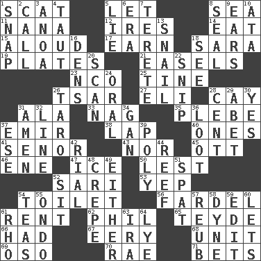 ACROSS 1. Get outta here! 5. Allow 8. Ocean 11. Nanny 12. Angers 14. Ingest 15. Verbally 17. Merit 18. "Two Mules for Sister ____" 19. Food holders 21. Artist's stands 23. Non-commissioned officer (abbr.) 25. Prong on a fork 26. Russian ruler of old 27. Connecticut Ivy Leaguer 28. Island 31. Wing 33. Tired old horse 35. Cadet 37. Independent ruler or chieftain 38. Pet locale 40. Singles 41. Sir (Sp.) 43. Not either 45. Baseball player Mel 46. Compass dir. 47. Frozen water 50. For fear that 52. Indian skirt 53. Slangy assent 54. Bathroom plumbing fixture 56. Burden 61. Monthly bill 62. Silvers or Donahue 65. Miss Universe 1986, Barbara Palacios _ 66. Possessed 67. Suggestive of the supernatural 68. A single undivided whole 69. Bear (Spanish) 70. Actress Charlotte 71. Stakes DOWN 1. Fastener 2. Give a ring to 3. Small Philippine buffalo 4. Drawn tight 5. Whopper 6. Epoch 7. Cylindrical with tapered ends 8. Lick closed 9. Hearing organs 10. _ moment's notice (2 wds.) 13. Slow-paced one 16. Cub Scout units 18. Observe 20. Skim 22. Sever or remove by pinching or nipping 24. Relating to the mouth 26. Edible starchy tuberous root 28. Penny 29. Collude with 30. Consenting reply 31. So be it 32. Actor's bit 34. Separate the seeds from cotton 36. Spoils 37. Compass dir. 39. More than one (prefix) 42. Monetary unit of Yemen 44. Coral ridge 48. Streamer paper 49. One or the other of two 51. Petty quarrel 52. Be seated 54. Afternoon social gatherings 55. Southwest Nigerian state 57. Reuben's nickname 58. Unit of force 59. Prepare for publication 60. Allows 61. 17th letter of the Greek alphabet 63. Retirement account (abbr.) 64. Potassium hydroxide