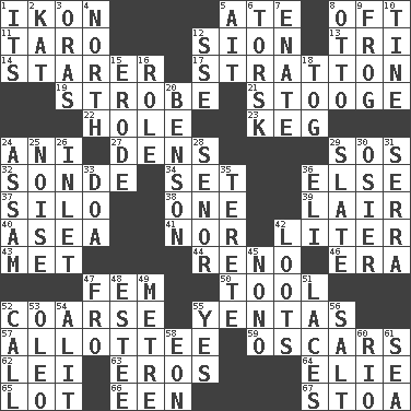 ACROSS 1. Visual representation of an object 5. Had dinner 8. Often (poetically) 11. Edible starchy tuberous root 12. The Jewish people; Israel 13. Three (prefix) 14. A viewer who gazes fixedly 17. Ski resort town in Vermont 19. Disco prop 21. Moe Howard, for one 22. Opening into or through something 23. Cask 24. Cuckoo 27. Habitations of wild animals 29. Distress signal 32. Message 34. Put into a specified state 36. Otherwise 37. Grain storage tower 38. Single 39. Den 40. Toward the sea 41. Not either 42. 61 cubic inches 43. Was introduced to 44. Western Nevada city 46. Epoch 47. Opposite of masc. 50. Instrument 52. Rough 55. Gossips 57. One to whom something is allotted 59. Motion picture awards 62. Flowery wreath 63. Greek god of love 64. Writer Wiesel 65. Car dealer's back yard 66. Car or cant ending 67. Portico DOWN 1. ___ a Wonderful Life 2. Krazy ___ of comics 3. Mouths or openings 4. Compass direction 5. Small island 6. Cod relative 7. Related on the mother's side 8. Von Bismarck 9. Toadlike animal 10. Prong on a fork 12. Compass dir. 15. Eat (away) 16. Hero or heavy, e.g. 18. Coat; cloak 20. Gillaume's butler role 24. Indian state 25. Annoying sound 26. An arm off of a larger body of water 28. Sir (Sp.) 29. Schedule 30. Flexible twig of a willow tree 31. Father Junipero _ 33. ___ good deed 35. Cigar-shaped 36. Connecticut Ivy Leaguer 42. Plunders 45. Words to Nanette 47. From 48. First name in cosmetics 49. Distance measurement (Brit.) 51. Shoestrings 52. Give a ring to 53. Butter sub 54. Came down and settled, as after flight 55. Affirmative reply 56. Table seasoning 58. A really long time 60. _ de Janeiro 61. Ocean