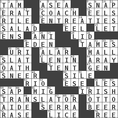 ACROSS 1. Scottish cap 4. At sea 8. Fastener 12. Part of Q.E.F. 14. Team commander 16. Snakelike fish 17. Cause heat under the collar 18. Pleas 20. First course 22. Snakelike fish 23. Allow 24. Followers of ems 25. Black tropical American cuckoo 28. Flaplike covering 30. Paradise 31. Makes less strong or intense 35. RI univ. 37. Having or resembling wings 40. Shopping center 41. Narrow board 42. Soviet premier 1918-24 44. Like ___ of sunshine 45. Pledge 46. Portable shelter 47. Commissioned military rank (abbr.) 48. Scornful expression 50. Drop; flow; fall 52. River (Sp.) 54. Compass dir. 55. French article 58. Plant excrement 61. Russian fighter aircraft 63. From or relating to Ireland 65. Interpreter 70. Von Bismarck 71. Helper 72. Father Junipero _ 73. Fermented drink made from hops 74. Raze (variant) 75. Louse (plural) 76. To sift DOWN 1. Laconic 2. Believer in; advocate of (suffix) 3. Promenades 4. Adept person 5. Male child 6. Erode 7. Land measure 8. Put into a specified state 9. Famous astronaut Armstrong 10. Toward shelter 11. Inconspicuous attention getter 13. Afternoon social gathering 15. The bottom of a shoe or boot 19. Set down 21. June honoree 26. Actress Patricia 27. An arm off of a larger body of water 29. Break 30. One or the other of two 32. Female horse 33. Flair 34. Mischievous 35. ____ Bator 36. Pace 38. One (Scot) 39. Wash lightly 41. Mayday 43. Nuclear Threat Initiatives 49. Basketball hoops 51. Luau accessory 53. Petroleums 55. 61 cubic inches 56. First name in cosmetics 57. Dinah or Pauly 58. Play the lead 59. Operatic vocal solo 60. Groovy apts. 62. Highlander 64. Director Reiner 66. Born 67. Three (prefix) 68. The grampus (Milton) 69. Actress Charlotte