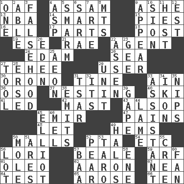 ACROSS 1. Clumsy lout 4. Indian state 9. American tennis player Robert 13. Basketball assoc. 14. Don Adams' spy role 15. Sliced desserts 16. Pipe bend 17. Actors' quests 18. Mail 19. Compass dir. 21. Actress Charlotte 22. Rep 24. Dutch treat 26. Ocean 27. Giggle 29. One who makes use of a thing 30. U. of Maine site 31. Prong on a fork 33. The 18th letter of the Arabic alphabet 36. Bear (Spanish) 37. Snuggling 40. What Jean-Claude Killy likes to do 41. Directed 42. Vertical spar for supporting sails 43. Columnist Joseph or Stewart 45. Independent ruler or chieftain 47. Aches 48. Allow 49. Folds over and sews together 50. Shopping centers 52. Parent Teacher Assoc. 54. And so on (abbr.) 56. Australian parrot (variant) 57. Calif. Air Force Base 59. Sandy's bark 61. Butter sub 62. Composer Copland 63. Teachers' org. 64. Trial 65. Came up 66. Nine, plus one DOWN 1. Single 2. Competent 3. It jiggles the polygraph 4. Viper 5. Excessive but superficial compliments 6. "Two Mules for Sister ____" 7. Johnson of "Laugh-In" 8. Mountains (abbr.) 9. Seem 10. The Jewish people; Israel 11. Command 12. Eastern Standard Time (abbr.) 20. Paradise 22. NE Netherlands city 23. Turn to the right 25. Age 27. Utensil 28. Celtic language 29. A single undivided whole 31. Russian ruler of old 32. It is 33. Helper 34. Image 35. Cuts off 38. Gives off 39. Yawn 44. Unable to walk 45. American author Paul (1891-1958) 46. Cartoonist voice _ Blanc 49. Rings 50. Undercover agent 51. Ancient Greek god of war 52. Lightbulb-shaped fruit 53. Pacific island yam 55. Algonquian 56. Car dealer's back yard 57. Sound made by sheep 58. Compass dir. 60. Avid follower