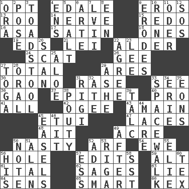 ACROSS 1. Choose 4. Peak District village in England 9. Greek god of love 13. Friend of Pooh 14. Boldness 15. Redecorate 16. White ___ sheet 17. Smooth fabric 18. Singles 19. Begley and Asner 21. Luau accessory 22. Tree or shrub in the Birch family 24. Go away! 26. Turn to the right 27. "_____ Recall" 29. Ancient Greek god of war 30. U. of Maine site 31. Raze (variant) 33. Observe 36. E Mali city 37. Curse 40. Adept person 41. 100% 42. Double curve, resembling the letter S 43. With great haste 45. Needle case 47. Shoestrings 48. Small island 49. Measure of real estate 50. Smutty 52. Sandy's bark 54. She-sheep 56. Opening into or through something 57. Prepares for publication 59. The first octave above the treble staff 61. Slanted text style (abbr.) 62. Gurus 63. Untruth 64. Elected reps. 65. Don Adams' spy role 66. A weed DOWN 1. Mouth or opening 2. Airs 3. Inedible or poisonous agaric 4. Followers of ems 5. Started a card game 6. Johnson of "Laugh-In" 7. 57 in ancient Rome 8. Car or cant ending 9. Eats (away) 10. French philosopher Descartes 11. Baltic tributary 12. Distress signal 20. Examine hastily 22. Match 23. Area sheltered from the wind 25. _ vera 27. Ancient Roman robe 28. Relating to the mouth 29. American tennis player Robert 31. Swiss mountan, "Queen of the Mountains" 32. Had dinner 33. High altitude stroll 34. 4th largest of the Great Lakes 35. Immeasurably long periods of time 38. Inclined to pout 39. Baby powder 44. Female horse 45. Artist's stands 46. Teat (slang) 49. Following 50. Short letter 51. ____ Jay Lerner 52. First man 53. Capital of Latvia 55. Writer Wiesel 56. Part of HMS, perhaps 57. Curvy letter 58. Fast jet (abbr.) 60. John Ritter's dad