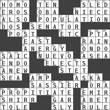 ACROSS 1. Same (prefix) 5. "___ Little Indians" 8. Downhill vehicle 12. Greek god of love 13. Chief or king in Benin or Nigeria 14. Sibling's daughter 15. In addition 16. Census information 19. Two (Sp.) 20. Legislator 21. Mail 23. And so on (abbr.) 24. Parent Teacher Association (abbr.) 27. Compass direction 30. Water falling in drops from the sky 31. Disorder of the immune system 34. Southwest Nigerian state 35. Ketch in the Levant 38. New (sp.) 40. At sea 41. Inside; within (prefix) 42. Chooses 44. Afresh 45. Proofreading order 46. Ocean 47. Electrical Unit 50. "____ silly question..." 53. More disrespectful 57. Mouth or opening 59. Conciliate 63. Independent ruler or chieftain 64. Bake eggs in their shells 65. Slender fish 66. Collude with 67. Lacquered or enameled metalware 68. Cunning 69. General guideline DOWN 1. Froth on beer 2. Lowest deck of a ship 3. With motion or animation 4. Bear (Spanish) 5. Drink excessively 6. Inky black, to poets 7. California wine valley 8. Be seated 9. Flowery wreath 10. Environmental prefix 11. Lair 14. Drug cop 17. Shoshoni 18. Car dealer's back yard 20. Comedian Laurel of Laurel & Hardy 22. Manatee 24. Baking dishes 25. Event that recurs at intervals 26. Small Philippine buffalo 28. Elected rep. 29. Loyal 30. Ridicules or criticizes harshly 32. Set 33. Jacques Cousteau's middle name 35. Oceans 36. Queen of England 1702-14 37. The content of cognition 39. Sep. follower 43. Separate forcefully 47. SW Saudi Arabia district 48. Floor covering 49. 23rd letter of the Greek alphabet 51. Dried seaweed eaten as food 52. Satellite of Uranus 54. Sinks 55. Slanted text style (abbr.) 56. Suggestive of the supernatural 58. Johnson of "Laugh-In" 59. Pacific Standard Time (abbr.) 60. 17th letter of the Greek alphabet 61. Lubricate 62. Before (prefix) 63. Ewer handle