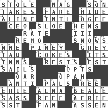 ACROSS 1. Fur scarf 6. Tired old horse 9. Boy, to dad 12. Proceeds 13. Conductor's collection 14. Flintstone garb 15. Place in a line 16. International (abbr.) 17. Double curve, resembling the letter S 18. Corporate head (abbr.) 19. _ gin 20. Coop moms 21. Pace 23. One more than two 24. San ____ (Riviera town) 25. Overwhelms 28. Compass dir. 30. Abounding in pines 34. Jennifer or Joel 35. The 19th letter of the Greek alphabet 36. Popular sodas 38. It is 39. Restaurants 41. Musical pauses 43. Eastern Standard Time (abbr.) 44. Moves on water 46. Chooses 48. Boat paddle 49. Brightly colored fish 50. Against 51. Friends 53. To riddle 56. 4th largest of the Great Lakes 57. _ mater 58. Calif. Air Force Base 60. Backtalk 61. Coral ridge 62. Nest on high 63. Fast jet (abbr.) 64. Air blower 65. NE Netherlands city DOWN 1. R.R. building 2. Baby powder 3. Migrant worker of the '30s 4. Poe poem 5. Compass dir. 6. Billionth: prefix 7. Johnson of "Laugh-In" 8. Set 9. Seigniories (variant) 10. Lyric poems 11. Born 13. Do some clerical work 14. Cultivating 19. Unemotional 20. Part of HMS, perhaps 22. Electrical Unit 24. One who advocates reunion 26. Moistens 27. System (abbr.) 28. Nuclear Threat Initiatives 29. Grandmother 31. Not either 32. Supplement with great effort 33. Affirmative reply 37. Halts 40. Chalkboards 42. Health resort 45. Indian title of respect (Mr.) 47. Threesomes 49. Norwegian king 50. Caspian sea tributary 51. Entreaty 52. So be it 54. Hearing organs 55. Writer Wiesel 56. Double-curved letter 57. Sandy's bark 58. Sound made by sheep 59. Car or cant ending