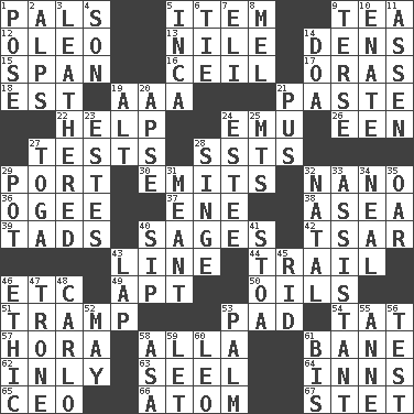 ACROSS 1. Friends 5. A whole individual unit 9. Beverage made from leaves 12. Margarine 13. Mediterranean tributary 14. Hiding places for outlaws 15. Connect, as a bridge 16. To provide with a ceiling 17. Mouths or openings 18. Eastern Standard Time (abbr.) 19. American Automobile Association (abbr.) 21. Thick mixture 22. Assist 24. Australian flightless bird 26. Car or cant ending 27. Trials 28. Fast planes 29. Sweet dark-red dessert wine 30. Gives off 32. Billionth: prefix 36. Double curve, resembling the letter S 37. Compass dir. 38. Toward the sea 39. Small amounts or degrees 40. Gurus 42. Russian ruler of old 43. Actor's bit 44. Get behind 46. And so on (abbr.) 49. Fitting 50. Lubricates 51. _____ steamer (cargo ship) 53. Writing tablet 54. Make lace 57. Israeli folk dance 58. Silent film actress Nazimova 61. Object of repulsion 62. Inwardly 63. Stitch closed the eyes of (a falcon) 64. Taverns 65. Corporate head (abbr.) 66. Smallest unit of an element 67. Proofreading order DOWN 1. Airs 2. High mountains 3. Tough but pliablecoriaceous 4. Manchild 5. South American Indian 6. Standoff 7. Biblical high priest 8. Cartoonist voice _ Blanc 9. Laconic 10. Related on the mother's side 11. NE Netherlands city 14. ___ good deed 19. The first octave above the treble staff 20. Domed church section 21. Festering 23. _____ Park, CO 24. First name in cosmetics 25. Mountains (abbr.) 27. Ancient Roman robe 28. Scorch 29. Cooking vessel 31. Intended 32. Brizilian seaport 33. Helper 34. Anneal 35. Boat paddle 40. Small drink 41. Portico 43. Infant locale 45. To free from 46. Moral principle 47. Marketplace scale 48. Monte _, Las Vegas Hotel/Casino 52. Fifth month 53. Inside of hand 55. Queen of England 1702-14 56. Trial 58. White ___ sheet 59. Allow 60. Lion 61. Twice