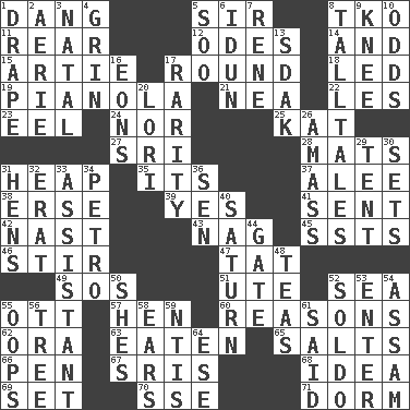 ACROSS 1. Mild oath, euphamism for damn 5. Title for a knight 8. Ring climax 11. Buttocks 12. Lyric poems 14. Plus 15. Nick name for Arthur 17. Single shot of ammunition 18. Directed 19. Player piano 21. Teachers' org. 22. French article 23. Snakelike fish 24. And not 25. Krazy ___ of comics 27. Indian title of respect (Mr.) 28. Floor protectors 31. Pile 35. It is 37. Toward shelter 38. Celtic language 39. Affirmative reply 41. Transmitted 42. Political cartoonist Thomas 43. Tired old horse 45. Fast planes 46. Use a swizzle stick 47. Make lace 49. Distress signal 51. Shoshoni 52. Ocean 55. Baseball player Mel 57. Layer 60. Thinks logically 62. Mouth or opening 63. Ingested 65. Table seasonings 66. Writing instrument 67. Indian titles of respect 68. It may be bright or harebrained 69. Arrange properly for use 70. Compass dir. 71. Dormintory (informal) DOWN 1. Window treatment 2. Nest on high 3. Relating to or accompanying birth 4. Smile widely 5. "Barney Miller" actor Jack 6. Goddess of spring and wife of Bragi 7. French philosopher Descartes 8. Baron Munchausen's specialties 9. Leg joint 10. Likelihood 13. Neighbor of Neb. 16. Immeasurably long periods of time 17. Noteworthy scarcity 20. Australian parrot (variant) 26. Collect or gather 29. Portable shelter 30. Arranges properly for use 31. Coop moms 32. Part of Q.E.F. 33. Aide 34. Stone: prefix 36. Elected rep. 40. Titan orbits this 44. Yard entry 48. Afternoon social gatherings 50. "______ My Girl" (Turtles hit) 52. Twentieth part of a lira 53. Keyboard key 54. Indian state 55. I made a mistake 56. Family _ (genealogy) 58. Hearing organs 59. Nuclear Threat Initiatives 61. Stated 64. Compass dir.
