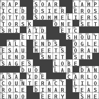 ACROSS 1. Hit sharply and swiftly 4. Fly high 8. Desk light 12. On the rocks 14. Flexible twig of a willow tree 16. Greek god of love 17. "Beetle Bailey" pooch 18. Wine waiters 20. Cod relative 22. Single 23. Arrange properly for use 24. _ Lanka 25. Help 28. And so on (abbr.) 30. Singer James 31. Yell 35. 100% 37. Conclusions 40. Stare 41. Son of Isaac 42. Confronts 44. Northwest Algerian city 45. Grant temporary use of 46. In a ____ (agitated or irritated) 47. Elected rep. 48. Gurus 50. Ear part 52. Superhero pair 54. Experiment locale 55. One of the 12 tribes of Israel 58. White ___ sheet 61. Binary compound 63. Monte _, Las Vegas Hotel/Casino 65. Act in opposition 70. _ and Stitch 71. Hero or heavy, e.g. 72. Middle Eastern gold or silver currency 73. Afternoon social gatherings 74. Inside; within (prefix) 75. Suggestive of the supernatural 76. A female animal or person DOWN 1. Disturbances 2. Thespian 3. _ dish (used to culture cells) 4. Distress signal 5. Bear (Spanish) 6. Direct toward a target or goal 7. San ____ (Riviera town) 8. Luau accessory 9. Ancient Greek god of war 10. Greater amount 11. Inconspicuous attention getter 13. Two (Sp.) 15. French philosopher Descartes 19. Allows 21. Krazy ___ of comics 26. A distinct part 27. Natives or inhabitants of Denmark 29. Opt 30. Dodged 32. Legendary monster 33. ____ Bator, Mongolia 34. "___ Little Indians" 35. Toward the sea 36. Long (Scottish) 38. Lair 39. Free from disturbance or agitation 41. Raised railways 43. Portico 49. Set of matching outer garments 51. English channel? 53. Wrote a lyric poem 55. Frees from moisture 56. Assad's deity 57. Trap for birds or small mammals 58. 43,560 square feet 59. Within a short period 60. Old (Scot.) 62. One of the Great Lakes 64. Keyboard modifier key 66. Modern: prefix 67. A saturated hydrocarbon 68. 4-wheeled motor vehicle 69. Attempt to accomplish something