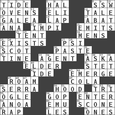 ACROSS 1. Event that recurs at intervals 5. Actor Linden 8. Compass dir. 11. Baking chambers 13. Biblical high priest 14. Falsehood 15. An organ shaped like a helmet 16. Pet locale 17. Blind as ____ 18. Santa ___, CA 19. Body of Kaffir warriors 21. Gives off 22. Portable shelter 24. Not women's 25. Is extant 27. Air pressure measure (abbr.) 29. Highlander 30. Thick mixture 32. Prong on a fork 33. Rep 35. "____ silly question..." 39. A person who is older than you are 41. Proofreading order 42. Binary compound 43. Develop 45. Wander 48. Root beer relative 49. Spanish missionary in California 50. Parka part 52. Three (prefix) 55. Stare 56. Grand Old Party 57. Keyboard key 59. Small Philippine buffalo 60. Australian flightless bird 61. Biscuitlike quick bread 62. Reproach for some lapse or misdeed 63. French article 64. Washington bills DOWN 1. Ancient Roman robe 2. "Terrible" tsar 3. Accusation by an informer 4. Compass dir. 5. Assist 6. Jai ____ 7. Mouth edge 8. Unit of acoustic absorption 9. Narrow boards 10. Moistens 12. Virtuous person 14. Not wild 20. Mountains (abbr.) 21. Give off 23. First name in cosmetics 25. Eastern Standard Time (abbr.) 26. One more than ninety 27. Baking dish 28. Fast jet (abbr.) 30. For each 31. Artist's stand 33. Find the sum of 34. Turn to the right 36. Ski resort town in Vermont 37. Cask 38. Had dinner 40. Pale green bean 43. Environmental prefix 44. Methods 45. Canadian anthropologist Darnell 46. Lowest deck of a ship 47. Type of rug 49. Fly high 50. Dwelling 51. Musical composition 53. French philosopher Descartes 54. Angers 56. Set 58. Non-commissioned officer (abbr.)