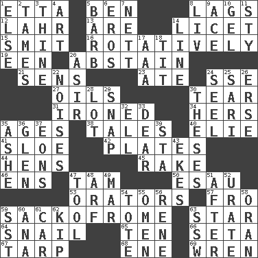 ACROSS 1. Singer James 5. Benjamin's nick name 8. Falls behind 12. Cowardly lion portrayer 13. "We ___ not amused" (Victoria) 14. It is permitted: Lat. 15. Stricken, poetically 16. Happening in regular succession 19. Car or cant ending 20. Choose not to consume 21. Elected reps. 23. Had dinner 24. Compass dir. 27. Petroleums 30. Separate forcefully 31. Pressed 34. Possessive pronoun 35. Eras 38. Lies 40. Writer Wiesel 41. A type of plum 42. Food holders 44. Coop moms 45. Immoral or dissolute person 46. Followers of ems 47. Scottish cap 50. He sold his birthright 53. Speakers 57. From 59. Italian handbag shop? 63. Play the lead 64. Slow-paced one 65. "___ Little Indians" 66. Stalk of a moss capsule 67. Canvas cover 68. Compass dir. 69. Songbird DOWN 1. Otherwise 2. Makes less strong or intense 3. One or ones belonging to thee 4. Nonscientific branch of learning 5. Sharp remark 6. Greek god of love 7. Remaining after all deductions 8. 54 in ancient Rome 9. Adept person 10. Set 11. Filthy place 14. Actor's bit 17. Auto club (abbr.) 18. Teat (slang) 20. SW Saudi Arabia district 22. Annoying sounds 24. Stitch closed the eyes of (a falcon) 25. Indian skirt 26. Celtic language 28. Car dealer's back yard 29. Fastener 30. College papers 32. Pipe bend 33. Letter starter 35. American tennis player Robert 36. Small, secluded valley 37. Immeasurably long periods of time 39. R.R. building 43. Makes supply last 47. Implement 48. Sandy's bark 49. Impair 51. Following 52. A salt of uric acid 54. Carry 55. Presage 56. French philosopher Descartes 58. NW Algerian seaport 59. Fast jet (abbr.) 60. Santa ___, CA 61. 4-wheeled motor vehicle 62. Sleep 63. Compass dir.