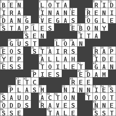 ACROSS 1. Benjamin's nick name 4. Globular water bottle used in Asia 8. To free from 11. Lyricist Gershwin 12. Silly 14. Painter Guido (1575-1642) 15. Mild oath, euphamism for damn 17. Viva Las _ 18. Stare 19. Paper fasteners 21. Dark wood 23. Elected rep. 24. Call ___ day 25. Abrupt rush of wind 27. Grant temporary use of 30. Greek goddess of the dawn 31. Flight of steps 34. Strike 37. Slangy assent 38. Assad's deity 39. Binary compound 40. Double-curved letter 41. Bathroom 43. Separate the seeds from cotton 44. Sliced desserts 45. Dutch treat 47. And so on (abbr.) 49. Portuguese money of account (variant) 50. Suffix with ecto or cyto 52. Fools 56. Saudi Arabian king (1953-1964) 57. Gambison 60. A blast of a horn 61. Probability 62. All-night dance parties 63. Compass dir. 64. Compass dir. 65. Lie 66. Fast jet (abbr.) DOWN 1. Auction offers 2. Part of Q.E.F. 3. Nanny 4. Make or become more lively 5. Singles 6. Label 7. Santa ___, CA 8. Canadian anthropologist Darnell 9. Inwardly 10. Pass on 13. Compass dir. 14. Carrot, for example 16. Global Positioning Systems (abbr.) 20. Allows 22. Storage container 25. Moves 26. United States Postal Service (abbr.) 27. Ms. Damita and namesakes 28. Of the mouth 29. American tennis player Robert 30. Sight organ 32. Jacques of French films 33. Medicinal plant 34. Capital of Latvia 35. First of billions? 36. Fenced enclosure 42. Adolescent 44. Personal Computers (abbr.) 46. Scratch 47. Evade 48. Bits 49. Remove soap 50. Groovy apts. 51. Spoil 52. Christmas carol 53. Charged atoms 54. Immeasurably long periods of time 55. Proofreading order 56. Distress signal 58. Feline 59. Federal power corp.