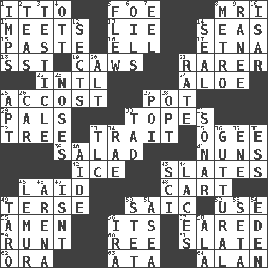 ACROSS 1. "Tell ____ the Marines!" 5. Enemy 8. Medical imaging device (abbr.) 11. Confronts 13. Untruth 14. Oceans 15. Thick mixture 16. Pipe bend 17. Inactive volcano in Sicily 18. Fast jet (abbr.) 19. Crow sounds 21. Less widely known 22. International (abbr.) 24. _ vera 25. Buttonhole 27. Plant holder 29. Friends 30. Drinks excessively 32. Family _ (genealogy) 33. Distinguishing feature 35. Double curve, resembling the letter S 39. First course 41. Religious women 42. Frozen water 43. Chalkboards 45. Put down 48. Draw slowly or heavily 49. Laconic 50. Ketch in the Levant 52. Purpose 55. So be it 56. It is 57. Having ears or earlike features 59. The smallest animal of a litter 60. To separate or throw off 61. Chalkboard 62. Mouth or opening 63. _ moment's notice (2 wds.) 64. ____ Jay Lerner DOWN 1. Naughty children 2. Beverages made from leaves 3. One of the two male reproductive glands 4. Baseball player Mel 5. Soared 6. Petroleums 7. Snakelike fish 8. Paris' subway 9. Indian princess (variant) 10. Austrian river, tributary to the Danube 12. Religious groups 14. Lick closed 20. Keyboard modifier key 21. Pace 23. Olfactory organs 25. Fitting 26. Automobile 27. Luau course 28. Choose 30. Bit 31. Echolocation 33. Affectionate concern, for short 34. Actress Charlotte 36. From the throat 37. Compass dir. 38. Double-curved letter 40. Helper 43. _-fi 44. Shoestrings 45. Arboreal primate 46. Sports stadium 47. Is not 49. Edible starchy tuberous root 50. Proofreading order 51. At sea 53. Stalk of a moss capsule 54. Paradise 56. Retirement account (abbr.) 58. Wing