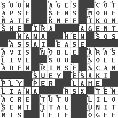 ACROSS 1. Within a short period 5. Grows older 9. Small bed 12. Domed church section 13. Elected reps. 14. Greater amount 15. Nathan's nickname 16. Leg joint 17. Image 18. A female animal or person 19. Lyricist Gershwin 21. Rep 22. Grandmother 24. Layer 26. Distress signal 27. Slender Brazilian palm 28. Relaxation 29. Advice 30. Impressive in appearance 32. Caspian sea tributary 36. Moving, as bait 37. "Barney Miller" actor Jack 38. Flatfish 39. An important port of Yemen 40. Wash lightly 42. Examine hastily 43. Chop _ 44. 1973 Nobel Price Winner (Physics) Leo 46. Travel a route regularly 49. For each 50. Unable to walk 51. Woody, climbing, usually tropical plant 53. Acura sports coupe 54. Nine, plus one 57. Land measure 58. Ballerina skirt 61. _ and Stitch 62. Transmitted 63. Slanted text style (abbr.) 64. A single undivided whole 65. Mountains (abbr.) 66. False hair 67. Double curve, resembling the letter S DOWN 1. Without 2. Brightly colored fish 3. Clearly or manifestly demonstrative 4. Born 5. "____ silly question..." 6. Commissioned mil. rank 7. Compass dir. 8. Compass dir. 9. Popular sodas 10. U. of Maine site 11. Portable shelters 14. Russian fighter aircraft 19. _ tizzy (2 wds.) 20. Water falling in drops from the sky 21. One (Scot) 23. NE Netherlands city 24. Rings 25. Compass dir. 27. Enthusiastic 28. Black 29. Chicken ___ king 31. Flexible twig of a willow tree 32. Indian state 33. Shooting up abruptly 34. Jai _ 35. Elected rep. 40. Sorrow 41. Snakelike fish 43. Health resort 45. Saxophone 46. Suffix with ecto or cyto 47. It is permitted: Lat. 48. Entertaining tales 52. Fish or hair follower 53. Court order 55. Writer Wiesel 56. Short letter 58. Teat (slang) 59. Shoshoni 60. Make lace 61. Nilotic language