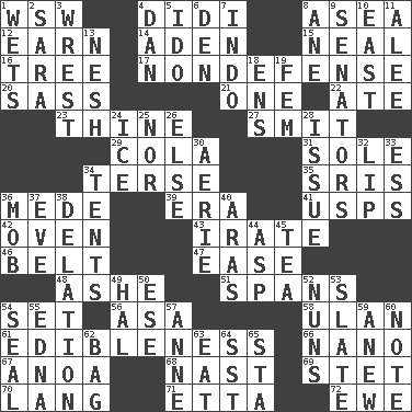 ACROSS 1. Compass dir. 4. "You Light Up My Life" star Conn 8. At sea 12. Merit 14. Arabian gulf 15. Anneal 16. Woody plant 17. Unrelated to defense, as in spending 20. Backtalk 21. Single 22. Had dinner 23. One or ones belonging to thee 27. Stricken, poetically 29. Root beer relative 31. Not divided or shared with others 34. Laconic 35. Indian titles of respect 36. Ancient Persian 39. Epoch 41. United States Postal Service (abbr.) 42. Baking chamber 43. Feeling or showing extreme anger 46. Waist strap 47. Relaxation 48. American tennis player Robert 51. Connects, as a bridge 54. Arrange properly for use 56. White ___ sheet 58. ____ Bator 61. The property of being fit to eat 66. Billionth: prefix 67. Small Philippine buffalo 68. Political cartoonist Thomas 69. Proofreading order 70. Austrian-born American filmmaker Fritz 71. Singer James 72. She-sheep DOWN 1. Moistens 2. "Two Mules for Sister ____" 3. Obtain by seizing forcibly or violently 4. One of the 12 tribes of Israel 5. Wedding promise 6. Lair 7. _ china 8. A saturated hydrocarbon 9. Elected representatives 10. Compass direction 11. Toward shelter 13. Soft 18. Followers of ems 19. Opposite of masc. 24. Frozen water 25. Not either 26. Otherwise 28. Come out of 30. Nest on high 32. Mouth edge 33. Double-curved letter 34. Portable shelters 36. Disorderly crowd 37. First lady 38. Conveyance 40. Ancient river in northeast Turkey 44. Cleo's killer 45. Beverage made from leaves 49. Actor Linden 50. Compass dir. 52. Religious women 53. Schedule 54. Lick closed 55. Pulitzer Prize-winning author Ferber 57. Singer Murray 59. Afresh 60. Make mention of 62. Paper or plastic container 63. Erode 64. Fast jet (abbr.) 65. R.R. building