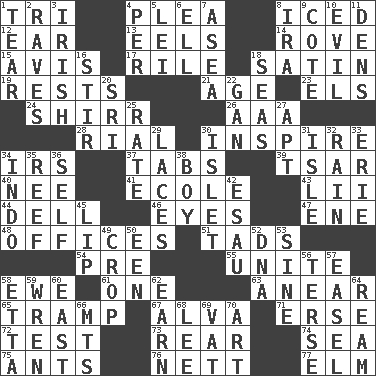ACROSS 1. Three (prefix) 4. Entreaty 8. On the rocks 12. Ewer handle 13. Snakelike fish 14. Be footloose 15. Deliberation 17. Cause heat under the collar 18. Smooth fabric 19. Musical pauses 21. Grow older 23. Raised railways 24. Bake eggs in their shells 26. Auto club (abbr.) 28. Monetary unit of Yemen 30. Motivate 34. Big collection agency 37. Bar bills 39. Russian ruler of old 40. Born 41. Learning spot: Fr. 43. Cards in a Roman deck? 44. Small valley 46. Sight organs 47. Compass dir. 48. Public positions 51. Bits 54. Before (prefix) 55. Join together 58. She-sheep 61. Single 63. Approach 65. _____ steamer (cargo ship) 67. Inventor's middle name 71. Celtic language 72. Trial 73. Tail end 74. Ocean 75. Pismires 76. Remaining after all deductions 77. Shade tree DOWN 1. Lacerate 2. All-night dance parties 3. From or relating to Ireland 4. For each 5. Flowery wreath 6. Pipe bend 7. Toward the sea 8. Lyricist Gershwin 9. ____ d'Azur (French Riviera) 10. Tending to cause great harm 11. Cub Scout units 16. Use a spoon 18. Oceans 20. _ Lanka 22. Separate the seeds from cotton 25. Assign a rank or rating to 27. Fitting 29. Shoestrings 30. Small island 31. Small island 32. Water falling in drops from the sky 33. One of the Great Lakes 34. _ china 35. Coral ridge 36. Automatically 38. Male child 42. Son of Isaac 45. Mouth edge 49. Riding implement 50. Car or cant ending 52. Heredity factor (abbr.) 53. Trig term 56. Laconic 57. Artist's stand 58. Singer James 59. Songbird 60. Compass direction 62. Merit 64. 480, 500 or 516 sheets of paper 66. Mountains (abbr.) 68. Area sheltered from the wind 69. Large container 70. Tate display