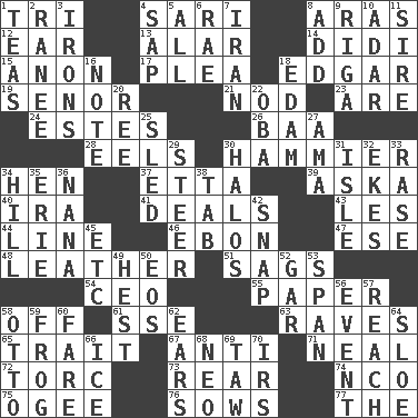 ACROSS 1. Three (prefix) 4. Indian skirt 8. Caspian sea tributary 12. Hearing organ 13. Having or resembling wings 14. "You Light Up My Life" star Conn 15. Soon (poet.) 17. Entreaty 18. _ Allan Poe 19. Sir (Sp.) 21. Lower and raise head in agreement 23. "We ___ not amused" (Victoria) 24. _____ Park, CO 26. Sound made by sheep 28. Snakelike fish 30. More given to overacting 34. Layer 37. Singer James 39. "____ silly question..." 40. Retirement account (abbr.) 41. Allots cards 43. French article 44. Actor's bit 46. Inky black, to poets 47. Compass dir. 48. Cordwainer's material 51. Sinks 54. Corporate head (abbr.) 55. Some stationery 58. Below a satisfactory level 61. Compass dir. 63. All-night dance parties 65. Distinguishing feature 67. Against 71. Actress Patricia 72. Torque (variant) 73. Tail end 74. Non-commissioned officer (abbr.) 75. Double curve, resembling the letter S 76. Sty mamas 77. Definite Article DOWN 1. Beverages made from leaves 2. The wife of a rajah (variant) 3. Metal shackles 4. Plant excrement 5. Everything 6. Actress Charlotte 7. SW Asia republic 8. Find the sum of 9. Capital of Latvia 10. The sixth month of the Jewish calendar 11. Beget 16. Short letter 18. Dutch treat 20. To separate or throw off 22. Chief or king in Benin or Nigeria 25. Downhill vehicle 27. Nanny (var.) 29. Navigate 30. Auras 31. Capri or Wight 32. Supplements with great effort 33. Raze (variant) 34. Land elevation 35. 4th largest of the Great Lakes 36. Nanny 38. Keyboard key 42. Fastener 45. And so on (abbr.) 49. Behest 50. Greek goddess of the dawn 52. Slender fish 53. Connect, as a bridge 56. Incident 57. Arrive at 58. "Beetle Bailey" pooch 59. Tree-dwelling hopper 60. Conductor's collection 62. Hearing organs 64. A type of plum 66. Frozen water 68. Modern: prefix 69. The 23rd letter of the Hebrew alphabet 70. Big collection agency