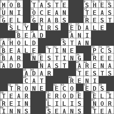 ACROSS 1. Crowd into 4. Clothes sense 9. "______ My Girl" (Turtles hit) 13. Single; one (prefix) 14. Sea 15. Beverages made from leaves 16. Set 17. Catches 18. Respite 19. Mischievous 21. Big collection agency 22. Peak District village in England 24. Necklace unit 26. Cuckoo 27. Hold, grip (Informal) 29. Comedian Laurel of Laurel & Hardy 30. Calif. Air Force Base 31. Prong on a fork 33. Personal Computers (abbr.) 36. Oblong piece of solid material 37. Nestling 40. To sift 41. Increase 42. Political cartoonist Thomas 43. Sports stadium 45. The sixth month of the Jewish calendar 47. Trials 48. Feline 49. Painter Guido (1575-1642) 50. Marketplace scale 52. Environmental prefix 54. Begley and Asner 56. Pull into pieces 57. Wear away 59. Connecticut Ivy Leaguer 61. It's straight from the horse's mouth 62. Ms. Damita and namesakes 63. Not either 64. Taverns 65. Actors Connery and Penn 66. Afternoon social gathering DOWN 1. Java container 2. Washington bills 3. Big road sign 4. Coat; cloak 5. Bitter 6. Singe 7. Bar bills 8. Followers of ems 9. Put through a sieve 10. Person who is morally reprehensible 11. Comfort 12. Fast jet (abbr.) 20. Shout 22. Consumed 23. Heredity factor (abbr.) 25. An important port of Yemen 27. Swedish rock group 28. Froth on beer 29. In a ____ (agitated or irritated) 31. Russian ruler of old 32. It is 33. Elected leader of a country 34. Penny 35. Oceans 38. Related on the mother's side 39. Yard entry 44. French philosopher Descartes 45. Oak nuts 46. One of the 12 tribes of Israel 49. "The Thinker" sculptor 50. Adolescent 51. Water falling in drops from the sky 52. 4th largest of the Great Lakes 53. Root beer relative 55. A type of plum 56. Three (prefix) 57. Raised railways 58. Double-curved letter 60. Retirement account (abbr.)