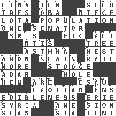 ACROSS 1. Pale green bean 5. "___ Little Indians" 8. Downhill vehicle 12. Angers 13. Chief or king in Benin or Nigeria 14. Sibling's daughter 15. Globular water bottle used in Asia 16. Census information 19. Single 20. Elected representative 21. Indian titles of respect 23. And so on (abbr.) 24. The first octave above the treble staff 27. Nuclear Threat Initiatives 30. Relationship diagram 31. Respiratory problem 34. Command 35. Soon (poet.) 38. Theater features 40. Pace 41. Greater amount 42. Moe Howard, for one 44. The sixth month of the Jewish calendar 45. Undercover agent 46. Layer 47. "We ___ not amused" (Victoria) 50. He sold his birthright 53. Of or relating to Laos or its people 57. Followers of ems 59. The property of being fit to eat 63. 4th largest of the Great Lakes 64. Damascus' land 65. A saturated hydrocarbon 66. The Jewish people; Israel 67. Oceans 68. R.R. building 69. Portable shelter DOWN 1. _ and Stitch 2. Removes the wrinkles 3. Distance measurement 4. White ___ sheet 5. Drink excessively 6. Inky black, to poets 7. California wine valley 8. Be seated 9. Luau accessory 10. Environmental prefix 11. Lair 14. Drug cop 17. Shoshoni 18. Car dealer's back yard 20. Fast planes 22. More lacking in sense or substance 24. Length times width 25. For fear that 26. False hair 28. ___ a Wonderful Life 29. "______ My Girl" (Turtles hit) 30. Threesomes 32. Floor covering 33. Smallest unit of an element 35. Nanny 36. Connecting point 37. NW Algerian seaport 39. "Barney Miller" actor Jack 43. Small, secluded valley 47. Silent film actress Nazimova 48. Actress Charlotte 49. A really long time 51. Nest on high 52. The state of being joined or united 54. Afternoon social gatherings 55. Is not 56. At sea 58. Posted 59. Double-curved letter 60. Color 61. Retirement account (abbr.) 62. Again 63. Eastern Standard Time (abbr.)