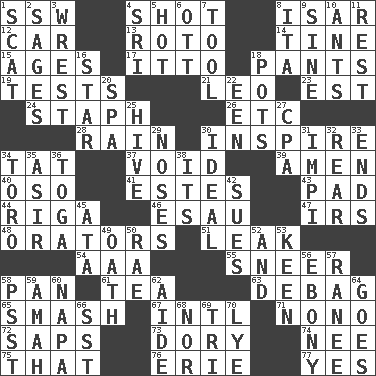 ACROSS 1. Compass dir. 4. Guess 8. Austrian river, tributary to the Danube 12. 4-wheeled motor vehicle 13. Printing process, for short 14. Prong on a fork 15. Ripens 17. "Tell ____ the Marines!" 18. Leg coverings 19. Trials 21. Lion 23. Eastern Standard Time (abbr.) 24. Staphylococcus 26. And so on (abbr.) 28. Precipitation 30. Heighten or intensify 34. Make lace 37. State of nonexistence 39. So be it 40. Bear (Spanish) 41. _____ Park, CO 43. Groovy apt. 44. Port city in Latvia 46. Son of Isaac 47. Big collection agency 48. Speakers 51. Path through which fluid escapes 54. American Automobile Association (abbr.) 55. Scornful expression 58. Baking dish 61. Afternoon social gathering 63. Debunk (Brit. slang) 65. Box-office sellout 67. International (abbr.) 71. Words to Nanette 72. Plant excrements 73. Dinghy 74. Born 75. Not this but _ 76. One of the Great Lakes 77. Consenting reply DOWN 1. Leave at once 2. Gurus 3. Obtain by seizing forcibly or violently 4. Indian title of respect (Mr.) 5. Being at a high temperature 6. Baseball player Mel 7. Utensil 8. Call ___ day 9. Trig term 10. Pismires 11. Repose 16. Play the lead 18. Cooking vessels 20. Health resort 22. Car or cant ending 25. Hub of activity 27. Accounting whiz (abbr.) 29. Olfactory organs 30. Standard of perfection 31. Body of Kaffir warriors 32. Located in or toward the back 33. Conclusions 34. "Corrida" creature 35. SW Saudi Arabia district 36. Ancient Roman robe 38. ___ a Wonderful Life 42. Takes to court 45. "One Day ___ Time" 49. Pledge 50. Actress Charlotte 52. Added to 53. Peachy ____! 56. Dark wood 57. Indian princess (variant) 58. Inconspicuous attention getter 59. Wet nurse 60. California wine valley 62. Helper 64. Leaves 66. Fast jet (abbr.) 68. Not either 69. Three (prefix) 70. Sodium hydroxide