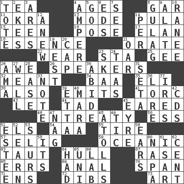ACROSS 1. Afternoon social gathering 4. Eons 8. Slender fish 11. Gumbo ingredient 13. Method 14. Monetary unit of Botswana 15. Adolescent 16. Airs 17. Style 18. Gist 21. Speak pompously 22. Put on (as clothing) 23. R.R. building 25. Turn to the right 26. Deep reverence 29. Orators 32. Intended 34. Sound made by sheep 35. Connecticut Ivy Leaguer 38. In addition 39. Sends forth 41. Torque (variant) 43. Allow 44. Bit 45. Having ears or earlike features 46. Plea 50. Double-curved letter 51. Raised railways 54. American Automobile Association (abbr.) 55. Become fatigued 57. Former Milwaukee Brewers owner Bud 59. Pertaining to the sea 63. Pulled tight 64. Frame or body of a ship 67. Raze (variant) 68. Blunders 69. Of or related to the anus 70. Connect, as a bridge 71. Followers of ems 72. Rights 73. Nonscientific branch of learning DOWN 1. Carryall 2. Supplements with great effort 3. Ancient Greek god of war 4. Electrical Unit 5. Thick or sticky substance 6. Begley and Asner 7. Observe 8. POW camp 9. Having winglike extensions 10. The wife of a rajah (variant) 12. Afresh 14. For each 19. Egg locale 20. Head covering 21. Rowing implement 23. Three-handed card game 24. Afternoon social gatherings 26. Nanny (var.) 27. Water source 28. Relaxation 30. Remain 31. Bristle 33. Make mention of 36. Old wives' tales, e.g. 37. Angers 39. Singer James 40. Hindu Mythology: god of death 42. Music discs 45. Jane of fiction 47. Tired old horse 48. Ringlike coral islands and reefs 49. Nervous spasm 51. First name in cosmetics 52. Acquire or gain knowledge or skills 53. Plays smoothly or legato 56. Hearing organs 58. It is 60. California wine valley 61. Austrian river, tributary to the Danube 62. Penny 64. Possessed 65. Corn or form start 66. Experiment locale