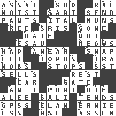 ACROSS 1. Slender Brazilian palm 6. "Barney Miller" actor Jack 9. Actress Charlotte 12. Damp 13. Indian skirt 14. Transmit 15. Leg coverings 16. Slanted text style (abbr.) 17. Religious women 18. Portuguese money of account (variant) 19. Indian titles of respect 20. Went 21. Pace 23. RI univ. 24. He sold his birthright 25. Catcalls? 28. Possessed 30. Approach 34. Fastener 35. Connecticut Ivy Leaguer 36. Literary convention 38. Lyricist Gershwin 39. Crowds into 41. Closes up, plugs up 43. Fast jet (abbr.) 44. Makes a sale 46. Relief 48. Hearing organ 49. Yard entry 50. Opposed to 51. Left side of a ship or aircraft 53. Expire 56. Toward shelter 57. Indonesian resort city 58. Looks after 60. Global Positioning Systems (abbr.) 61. Liveliness 62. Bert's buddy 63. Double-curved letter 64. Overdraft (abbr.) 65. NE Netherlands city DOWN 1. Electrical Unit 2. Fly high 3. Trig term 4. Michaelmas daisies 5. It is 6. Suttee (variant) 7. Mouths or openings 8. Petroleum 9. One who advocates reunion 10. Queen of England 1702-14 11. Begley and Asner 13. Title for a man of rank and authority 14. Sounds asleep 19. Check the growth or development of 20. Chewing product 22. American Automobile Association (abbr.) 24. The property of being fit to eat 26. Armed conflicts 27. Argument over a trivial matter 28. Folds over and sews together 29. Medicinal plant 31. Greek goddess of the dawn 32. Fitting 33. Friend of Pooh 37. Small fatty European fish 40. Chalkboards 42. Put into a specified state 45. Indian title of respect (Mr.) 47. Spring feasts 49. Amused look 50. High mountains 51. Friends 52. Norwegian king 54. Lodging establishments 55. Singer Brickell 56. Mature 57. Benjamin's nick name 58. Beverage made from leaves 59. Elected rep.