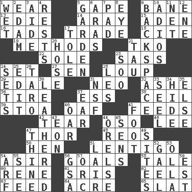 ACROSS 1. Put on (as clothing) 5. Yawn 9. Object of repulsion 13. Singer Brickell 14. Like ___ of sunshine 15. Arabian gulf 16. Small amounts or degrees 17. Swap 18. Quote 19. Modes 21. Ring climax 22. Flatfish 23. Backtalk 24. Arrange properly for use 27. Elected rep. 28. Central Nebraska county 29. Peak District village in England 31. Modern: prefix 32. American tennis player Robert 36. Become fatigued 37. Double-curved letter 38. To provide with a ceiling 39. Portico 40. Clumsy lout 41. Eats 42. Separate forcefully 44. Bear (Spanish) 46. Area sheltered from the wind 47. Son of Odin 48. Vintage cars 50. Layer 51. Small, flat, pigmented spot on the skin 54. SW Saudi Arabia district 56. Purposes of endeavors 58. Story 60. French philosopher Descartes 61. Indian titles of respect 62. Snakelike fish 63. Nourish 64. Measure of real estate 65. Narrow board DOWN 1. Dripping 2. Dutch treat 3. Assistant 4. Musical pauses 5. Place where plants grow 6. Caspian sea tributary 7. Writing tablet 8. Sight organ 9. Keyboard key 10. Goodbye (Sp.) 11. Fish or hair follower 12. Compass dir. 17. Lacquered or enameled metalware 20. Stockings 21. The 19th letter of the Greek alphabet 23. "Barney Miller" actor Jack 24. Puts into a specified state 25. Prepare for publication 26. Pacific island yam 28. French article 30. Tough but pliablecoriaceous 31. Science/research agcy. 33. Sew up the eyelids of hawks and falcons 34. Flintstone garb 35. Otherwise 37. Ewer handle 40. Rowing implement 41. Lowest support of a structure 43. Age 44. Threatening words 45. Elected reps. 47. One or ones belonging to thee 49. Settings 51. Den 52. Highlander 53. Water jar 54. Sandy's bark 55. Perceive with the eye 56. Girls' org. (abbr.) 57. The grampus (Milton) 59. Eastern Standard Time (abbr.)