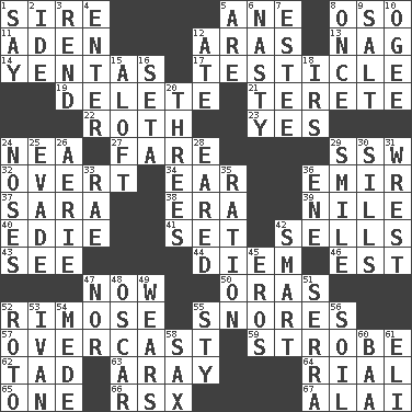 ACROSS 1. Beget 5. A saturated hydrocarbon 8. Bear (Spanish) 11. An important port of Yemen 12. Ancient river in northeast Turkey 13. Tired old horse 14. Gossips 17. One of the two male reproductive glands 19. Erase 21. Cigar-shaped 22. Writer of Portnoy's Complaint (1969) 23. It is so 24. Teachers' org. 27. Conductor's collection 29. Compass dir. 32. Unconcealed 34. Ewer handle 36. Independent ruler or chieftain 37. "Two Mules for Sister ____" 38. Period 39. Mediterranean tributary 40. Singer Brickell 41. Put into a specified state 42. Makes a sale 43. Observe 44. South Vietnam president (1954) 46. Eastern Standard Time (abbr.) 47. Immediately 50. Mouths or openings 52. Full of chinks, cracks, or crevices 55. Sounds asleep 57. Cloudy 59. Disco prop 62. Small amount or degree 63. Like ___ of sunshine 64. Monetary unit of Yemen 65. Single 66. Acura sports coupe 67. Jai ____ DOWN 1. Declare 2. Binary compound 3. Tear apart 4. Keyboard key 5. "We ___ not amused" (Victoria) 6. Difficult 7. First name in cosmetics 8. Single time 9. Table seasoning 10. Double curve, resembling the letter S 12. Had dinner 15. At or to great height 16. Stalk of a moss capsule 18. Big collection agency 20. Triads 24. Olfactory organs 25. Dodge 26. Nest on high 28. Having ears or earlike features 29. Grin 30. Beverly of Met fame 31. Obtain by seizing forcibly or violently 33. Actress Charlotte 35. Food allowance for one day 36. Compass dir. 42. Don Adams' spy role 45. Greek god of love 47. Or not 48. Witty Wilde 49. Puts on (as clothing) 51. Father Junipero _ 52. Printing process, for short 53. "Terrible" tsar 54. Ancient Persian 55. Filthy place 56. The visible part of the earth's surface 58. Saxophone 60. Sound made by sheep 61. Connecticut Ivy Leaguer