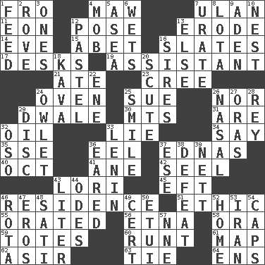 ACROSS 1. From 4. Informal term for the mouth 7. ____ Bator, Mongolia 11. Period of immesurable duration 12. Airs 13. Eat (away) 14. First lady 15. Collude with 16. Chalkboards 17. Writing tables 19. Helper 21. Had dinner 23. Algonquian 24. Baking chamber 25. Institute legal proceedings 26. And not 29. A sleeping potion; an opiate (poet.) 30. Mountains (abbr.) 31. "We ___ not amused" (Victoria) 32. Lubricate 33. Falsehood 34. Declare 35. Compass dir. 36. Snakelike fish 37. Ferber et al. 40. Sep. follower 41. One (Scot) 42. Stitch closed the eyes of (a falcon) 43. Australian parrot (variant) 45. Lizard (obsolete) 46. Home 51. Value system 55. Declaimed 56. Inactive volcano in Sicily 58. Mouth or opening 59. Lugs 60. Undersized animal 61. Atlas unit 62. SW Saudi Arabia district 63. Make a knot 64. Followers of ems DOWN 1. Nourish 2. Be footloose 3. Singles 4. Disorderly crowd 5. Toward the sea 6. Soaks 7. A salt of uric acid 8. Globular water bottle used in Asia 9. An important port of Yemen 10. Egg locale 12. Soft color 13. Otherwise 16. Titles for men of rank and authority 18. Polynesian shrub of the pepper family 20. Scutum 22. Compass dir. 24. A small or young owl 25. Grin 26. Relating to the nose 27. Mouths or openings 28. Marina Del _, California 29. Plate 32. Bear (Spanish) 33. Soviet premier 1918-24 36. Having ears or earlike features 37. Compass dir. 38. Outscore 39. Remaining after all deductions 43. 61 cubic inches 44. Lyric poems 46. Round or rotation of duties 47. Greek god of love 48. Suttee (variant) 49. Foregone conclusion 50. Needle case 52. Dwelling 53. SW Asia republic 54. Smile enhancers 57. Compass dir.