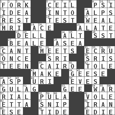 ACROSS 1. Tined utensil 5. To provide with a ceiling 9. Air pressure measure (abbr.) 12. The content of cognition 13. To the inside or interior of 14. High mountains 15. Relief 16. Trial 17. Welt 18. Medical imaging device (abbr.) 19. Adept person 21. Having winglike extensions 22. Small valley 24. Keyboard modifier key 26. Fast jet (abbr.) 27. Memphis, Tenn. Street 28. At sea 29. Patter 30. Confronts 32. Shade of tan 36. At one time in the past 37. _ Lanka 38. Indian titles of respect 39. Adolescent 40. Capital of Egypt 42. Lacquered or enameled metalware 43. Cause to be 44. Honkers 46. Viper 49. RI univ. 50. Nights before holidays 51. POW camp 53. Unit of force equal to gravity 54. Armed conflict 57. Monetary unit of Yemen 58. Monetary unit of Botswana 61. Grand slam 62. Singer James 63. Sever or remove by pinching or nipping 64. SW Asia republic 65. Compass dir. 66. Periodic rise and fall of the sea level 67. Singer Brickell DOWN 1. Become taut 2. Baltic tributary 3. Home 4. Krazy ___ of comics 5. Quote 6. Compass dir. 7. It is 8. Car dealer's back yard 9. Entreaties 10. Arguments over trivial matters 11. Small island 14. Leather borer 19. Everything 20. To starve (Brit.) 21. _ moment's notice (2 wds.) 23. Consumed 24. Having gotten out of bed 25. French article 27. Object of repulsion 28. Nest on high 29. Small bed 31. 1973 Nobel Price Winner (Physics) Leo 32. First name in cosmetics 33. What you're doing now 34. Cause heat under the collar 35. Purpose 40. Automobile 41. Double curve, resembling the letter S 43. Large cup 45. First lady 46. Match 47. Sets or collections 48. Food holder 52. Insect wing 53. Stare wonderingly 55. Jai _ 56. French philosopher Descartes 58. Pacific Standard Time (abbr.) 59. Single; one (prefix) 60. Hat (slang) 61. Compete