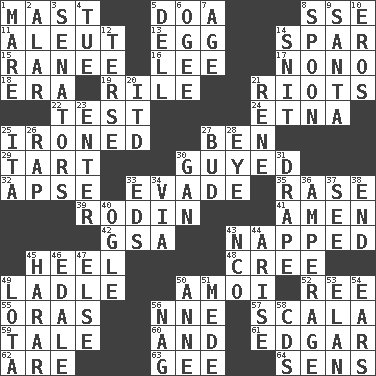 ACROSS 1. Vertical spar for supporting sails 5. ___ good deed 8. Compass dir. 11. Native American of Southwest Alaska 13. Oval reproductive body of a fowl 14. Coast Guard woman 15. The wife of a rajah (variant) 16. Area sheltered from the wind 17. Words to Nanette 18. Period 19. Cause heat under the collar 21. Debaucheries 22. Trial 24. Inactive volcano in Sicily 25. Pressed 27. Benjamin's nick name 29. Small pie 30. Secured 32. Domed church section 33. Elude 35. Raze (variant) 39. "The Thinker" sculptor 41. So be it 42. Girls' org. (abbr.) 43. Slept 45. Person who is morally reprehensible 48. Algonquian 49. Dipping utensil 50. Mine, in Marseilles 52. Portuguese money of account (variant) 55. Mouths or openings 56. Compass dir. 57. Any of the three canals of the cochlea 59. Lie 60. Added to 61. _ Allan Poe 62. "We ___ not amused" (Victoria) 63. Unit of force equal to gravity 64. Elected reps. DOWN 1. Female horse 2. Having or resembling wings 3. Legislators 4. Third day of the wk. 5. Small valley 6. Double curve, resembling the letter S 7. Mature 8. Soup utensil 9. Before Barbara or Clara 10. Greek god of love 12. Laconic 14. In a ____ (agitated or irritated) 20. It would 21. French philosopher Descartes 23. Keyboard key 25. Call ___ day 26. Hit sharply and swiftly 27. Partially opened flower 28. Sight organ 30. Separate the seeds from cotton 31. Window treatment 33. Begley and Asner 34. By way of 36. Electrical Measurement 37. Perceive with the eye 38. Conclusion 40. Stare 43. Non-commissioned officer (abbr.) 44. Originate 45. Ethiopian city, capital of Harari 46. Peak District village in England 47. Otherwise 49. Globular water bottle used in Asia 50. Singer Murray 51. Ancient Persian 53. Enthusiasm 54. Hearing organs 56. Tired old horse 58. Music discs