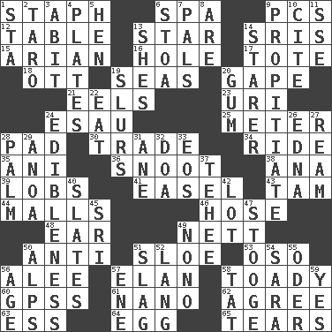 ACROSS 1. Staphylococcus 6. Health resort 9. Personal Computers (abbr.) 12. Eating place 13. Play the lead 14. Indian titles of respect 15. Believer in; advocate of (suffix) 16. Hollow 17. Carryall 18. Baseball player Mel 19. Oceans 20. Yawn 21. Snakelike fish 23. RI univ. 24. Son of Isaac 25. Distance measurement 28. Writing tablet 30. Swap 34. Travel on or in a vehicle 35. Cuckoo 36. Snob 38. Santa ___, CA 39. Tennis shots 41. Artist's stand 43. Scottish cap 44. Shopping centers 46. Flexible conduit 48. Ewer handle 49. Remaining after all deductions 50. Against 51. _ gin 53. Bear (Spanish) 56. Toward shelter 57. Enthusiasm 58. Sycophant 60. Global Positioning Systems (abbr.) 61. Billionth: prefix 62. Match 63. Curvy letter 64. Oval reproductive body of a fowl 65. Rends DOWN 1. R.R. building 2. Edible starchy tuberous root 3. "This won't hurt ____!" 4. Food holders 5. Layer 6. Portico 7. Friends 8. "We ___ not amused" (Victoria) 9. Appease 10. Quote 11. Compass dir. 13. "______ My Girl" (Turtles hit) 14. A viewer who gazes fixedly 19. Runs notes together 20. Chewing product 22. Erode 24. The property of being fit to eat 26. Pulitzer Prize-winning author Ferber 27. 480, 500 or 516 sheets of paper 28. Inside of hand 29. Small Philippine buffalo 31. One (Scot) 32. ___ good deed 33. Greek goddess of the dawn 37. Giggle 40. Chalkboards 42. Car dealer's back yard 45. Indian title of respect (Mr.) 47. Moe Howard, for one 49. Words to Nanette 50. High mountains 51. Volcanic refuse 52. Long (Scottish) 54. "Two Mules for Sister ____" 55. River in Europe 56. Ripen 57. Compass dir. 58. Make lace 59. It is so